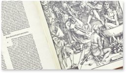 Dieser weltberühmte Holzschnitt ist eine visuelle Bewegungslawine, die den unwiderstehlichen Ansturm der Vier Reiter im Detail darstellt. Obwohl sie gemeinsam abgebildet werden, deutet ihr gestaffeltes Herannahen darauf hin, dass sie nacheinander auftreten. Wenn sie die Menschen auf der Welt unter ihren Hufen mit Füßen treten, wird der Kopf eines Bischofs, der eine Mitra trägt, von einer Schlange mit Reißzähnen gleich aufgefressen - ein Zeichen der beginnenden Reformation?