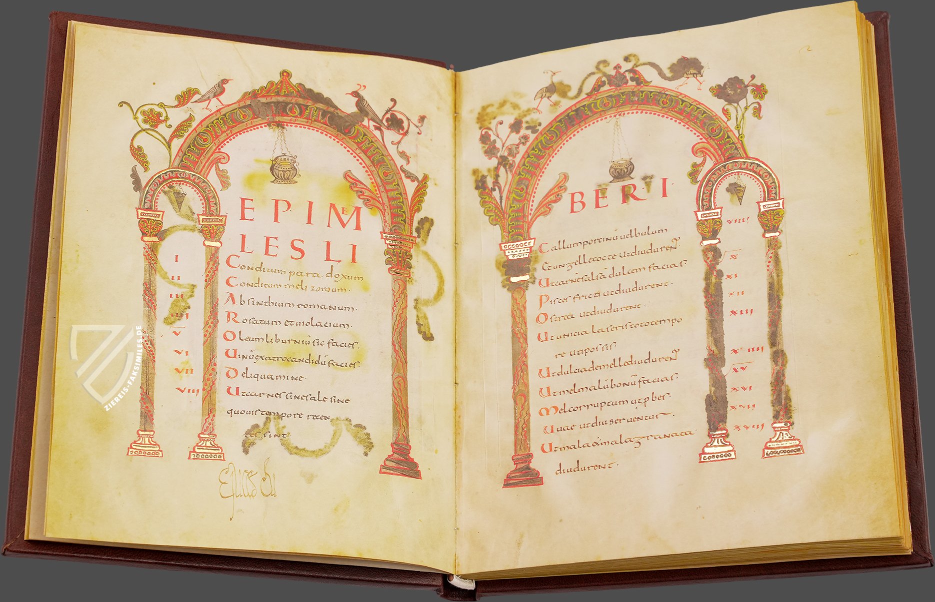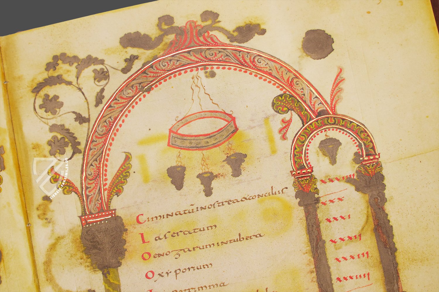 Dekorative Arkaden mit stilisiertem Blattwerk, Vögeln und hängenden Lampen ruhen auf feinen Säulen mit verzierten Akanthuskapitellen. Die Verwendung eines Doppelbogens, wobei der kleinere Bogen die römischen Ziffern für jedes Kapitel enthält, ist ziemlich einzigartig und deutet zusammen mit der quadratischen Form der Seiten darauf hin, dass dieses Manuskript eng an ein antikes Original angelehnt ist.