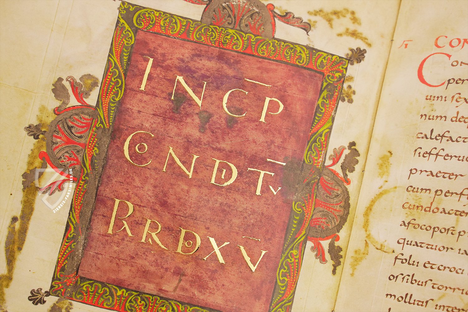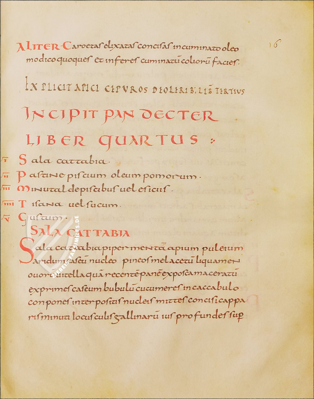 Kapitel 1 dieser Handschrift wird von einer prächtigen Incipit-Seite eingeleitet, für die nur die feinsten und teuersten Materialien verwendet wurden - grüne, rote und gelbe Palmetten, Purpurfarbe für das Pergament und Goldtinte für den Text. Das Incipit enthält den Anfang eines Rezepts für Conditum Paradoxum, was so viel wie "Würzwein" bedeutet. Es handelt sich dabei um eine Reihe von Würzweinen, die bei den Römern beliebt waren und aus folgenden Zutaten bestanden: Wein, Honig, Pfeffer, Mastix, Lorbeer, Safran, Dattelsamen und in Wein eingeweichte Datteln.