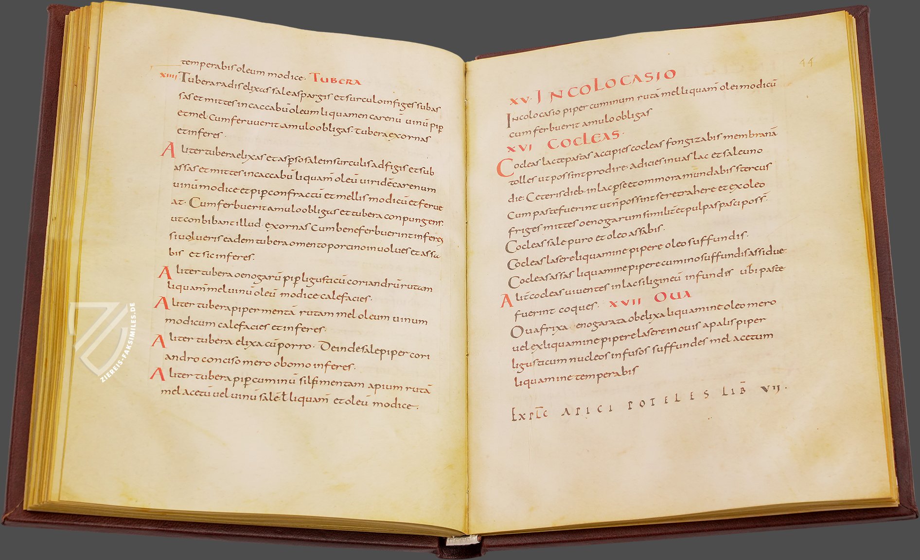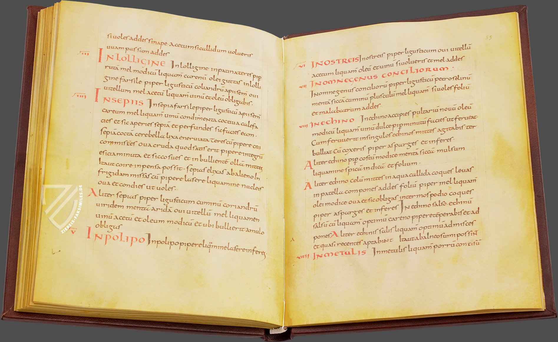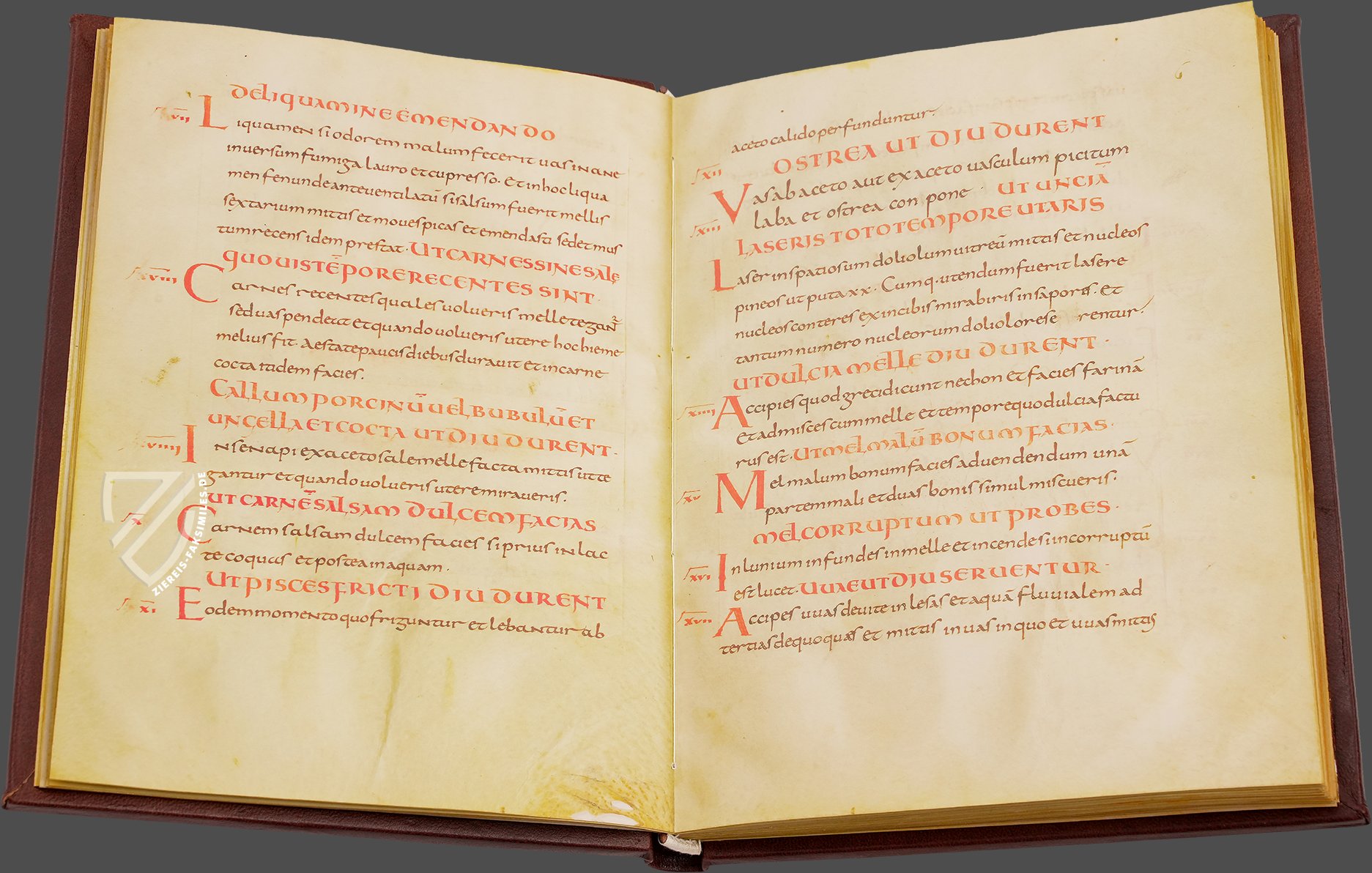 Das berühmte römische Kochbuch des Apicius in einer der nur mehr zwei erhaltenen Ausgaben des 9. Jahrhunderts! Das geschichtsträchtige Werk des römischen Feinschmeckers Apicius aus dem 1. Jahrhundert nach Christus wurde vermutlich bis ins 4. Jahrhundert ergänzt und optimiert und gilt heute als unschätzbares Zeugnis römischer Kochkunst und Kultur. Um die Mitte des 9. Jahrhunderts wurde im berühmten Skriptorium von St. Martin de Tours diese prächtige Handschrift geschaffen, die den Text des Apicius in einer luxuriösen Ausgabe präsentiert. Ein Herrlicher Einblick in die Geschichte und noch heute ein Fest für Gourmets!