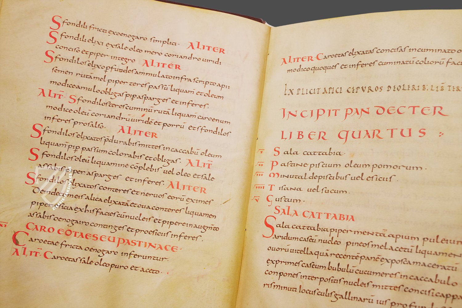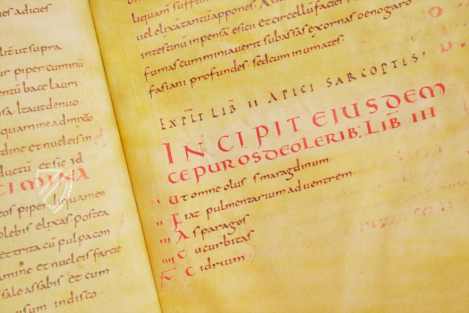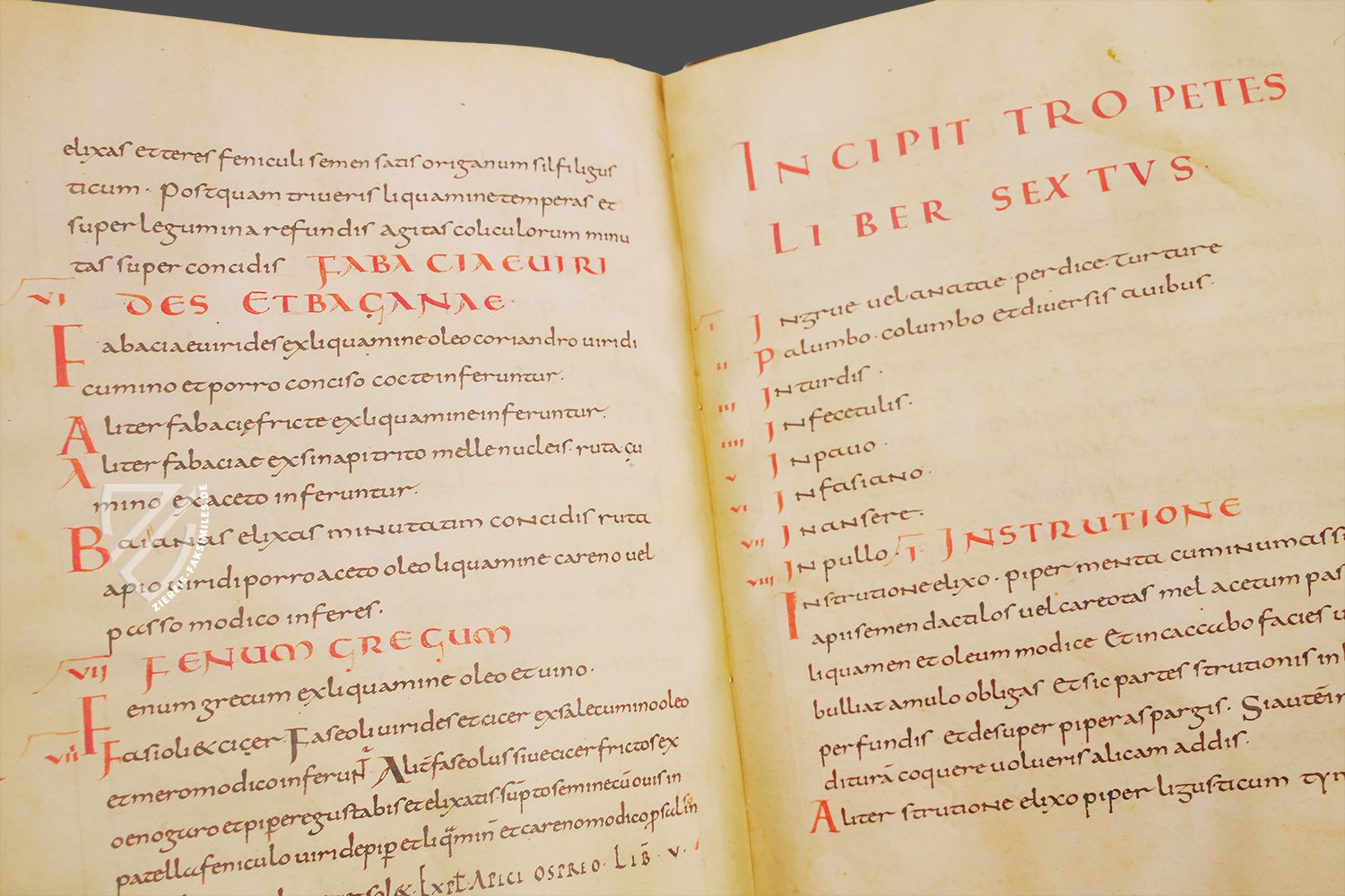 Das berühmte römische Kochbuch des Apicius in einer der nur mehr zwei erhaltenen Ausgaben des 9. Jahrhunderts! Das geschichtsträchtige Werk des römischen Feinschmeckers Apicius aus dem 1. Jahrhundert nach Christus wurde vermutlich bis ins 4. Jahrhundert ergänzt und optimiert und gilt heute als unschätzbares Zeugnis römischer Kochkunst und Kultur. Um die Mitte des 9. Jahrhunderts wurde im berühmten Skriptorium von St. Martin de Tours diese prächtige Handschrift geschaffen, die den Text des Apicius in einer luxuriösen Ausgabe präsentiert. Ein Herrlicher Einblick in die Geschichte und noch heute ein Fest für Gourmets!