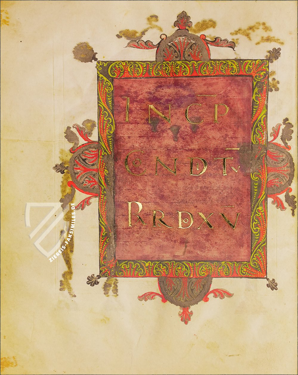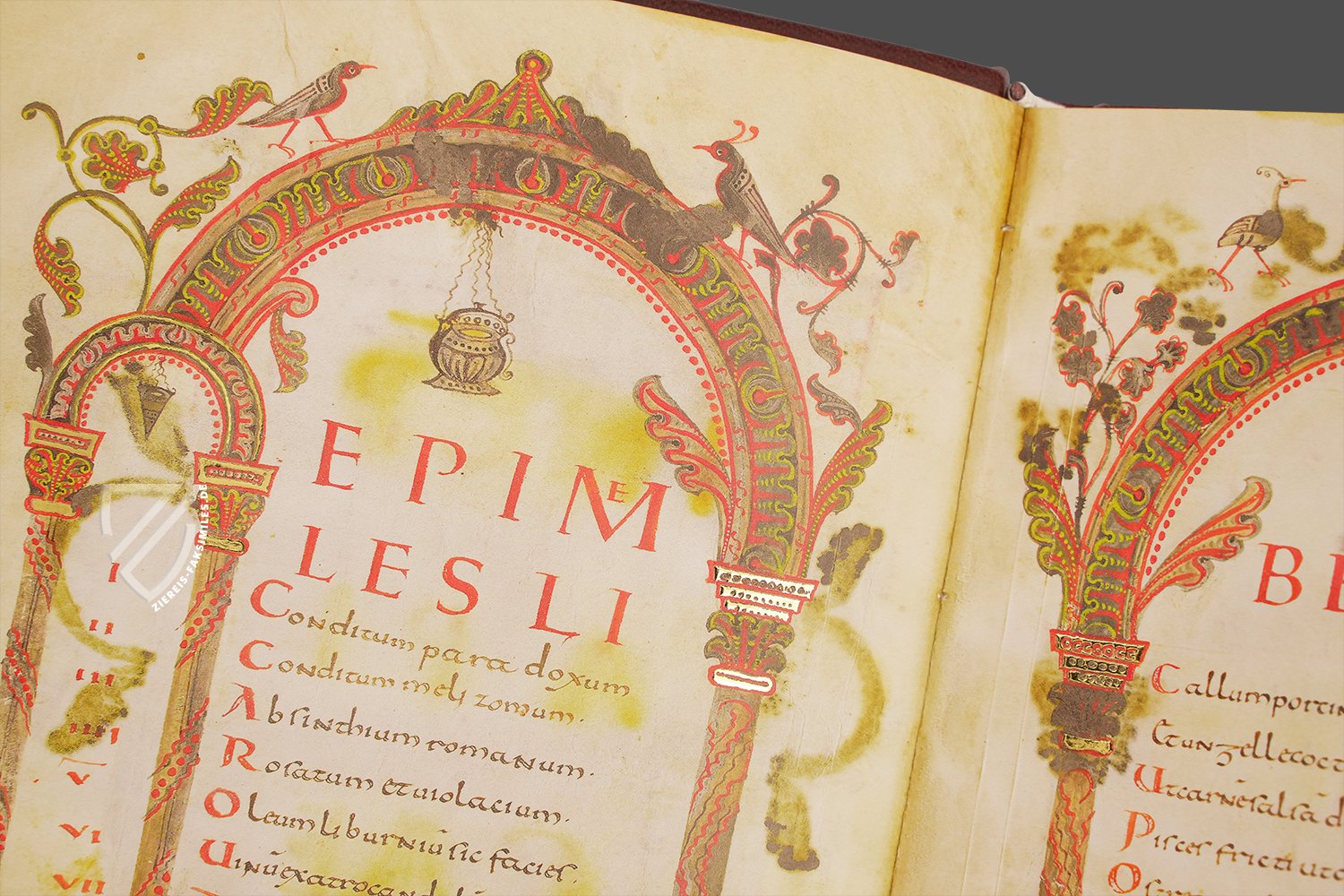 Vier Seiten mit architektonischen Rahmen, die insgesamt auch an die Kanontafeln des Eusebius erinnern können, stellen das Inhaltsverzeichnis der Handschrift dar. Der Titel des ersten Buches in großen roten Buchstaben ist ohne die gegenüberliegende Seite unvollständig: Epimeles Li[beri] oder "Der sparsame Wirtschafter". Bei den grauen Elementen handelt es sich in Wirklichkeit um angelaufenes Silber, das ursprünglich neben dem Gold auf der Seite geglänzt hat.