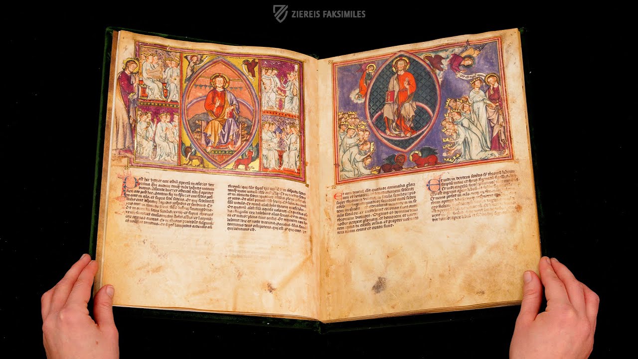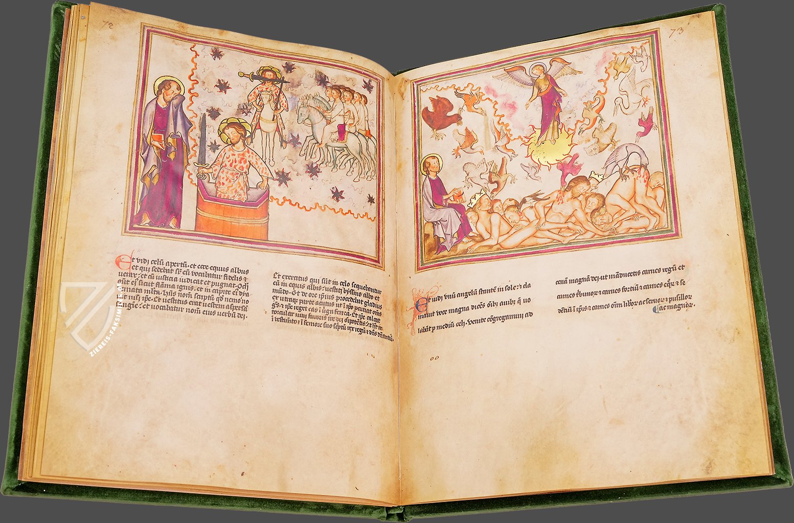 Jede Seite dieses gotischen Bilderbuchs präsentiert Johannes Vision der Endzeit in prachtvollen halbseitigen Miniaturen â von dessen Beauftragung durch Gott Ăźber die Ăffnung des Buchs mit sieben Siegeln hin zum neuen Jerusalem und Christi abschlieĂenden Worten zu dem ihn anbetenden Johannes. Letzter wohnt den allermeisten Geschehnissen als Beobachter bei, entweder als Teil der Szene oder aber von auĂerhalb des Bildes, wobei er oft durch schmale Fenster mit geĂśffnetem Fensterladen durch den Rahmen âin die jeweilige Miniaturâ blickt. Dies greift den Visionscharakter der Offenbarung auf und bietet der Leserschaft sogleich eine Identifikationsfigur beim eigenen Sehen der fantastischen Bilder. Passend dazu strecken die vier Evangelistensymbole (geflĂźgelter LĂśwe, Stier, Engel und Adler) Johannes in den Miniaturen zu den vier apokalyptischen Reitern Schriftrollen entgegen, auf denen steht: âveni et vidiâ â âkomm und siehâ.