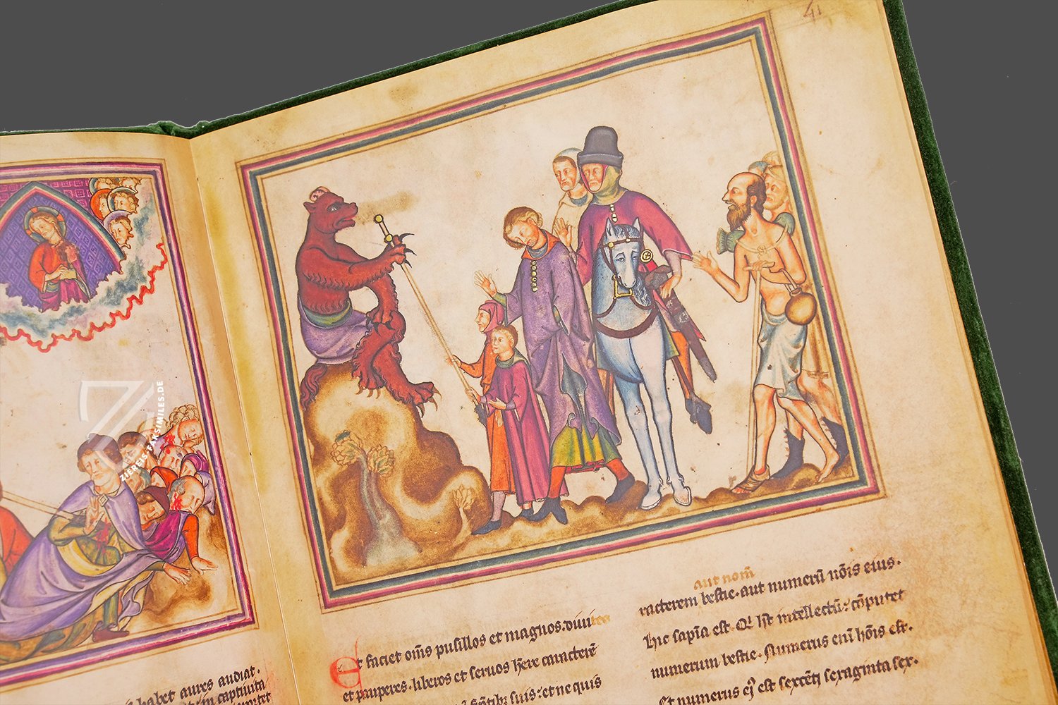 Die in den 1320er Jahren in der Normandie entstandene Apokalypse von Saint-Victor fĂźhrt ihrer Leserschaft die endzeitliche Vision des Johannes von Patmos auf 83 illuminierten Seiten auĂerordentlich kunstvoll vor Augen. Die 83 prächtigen halbseitigen Miniaturen im gotischen Weichen Stil entfĂźhren in die furchterregenden Geschehnisse, die der Autor der Offenbarung, des letzten Buchs der Bibel, prophezeit, wobei seine Rolle als Beobachter immer wieder gekonnt ins Bild gesetzt wird. Nicht weniger Aufmerksamkeit wird dem restlichen, fantastischen Figurenprogramm der Offenbarung zuteil, das in einer harmonisch abgestimmten Farbpalette erscheint. Seinen Namen hat das gold- und silbergeschmĂźckte Bilderbuch von der Abtei Saint-Victor bei Paris, wo die Handschrift im späten 18. Jahrhundert zeitweise verwahrt wurde.