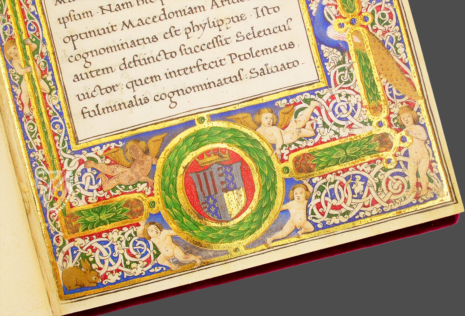 Der opulente Zierrahmen der ersten Seite gibt Aufschluss über das royale Patronat der Handschrift: Vier Putten tragen einen goldgesäumten Lorbeerkranz, der das Wappen König Ferdinands I. bzw. Ferrantes von Neapel umfängt. Über dem Wappenschild mit Fleurs-de-Lys und roten Streifen schwebt zudem eine goldene Krone. Trotzdem streitet die Forschung darüber, ob wirklich Ferdinand I. die prächtige Handschrift beauftragt hat oder aber sein dritter Sohn Johannes von Neapel. Sicher ist nur, dass ein Mitglied der königlichen Familie unter Ferdinand I. das astronomsiche Kleinod anfertigen ließ.