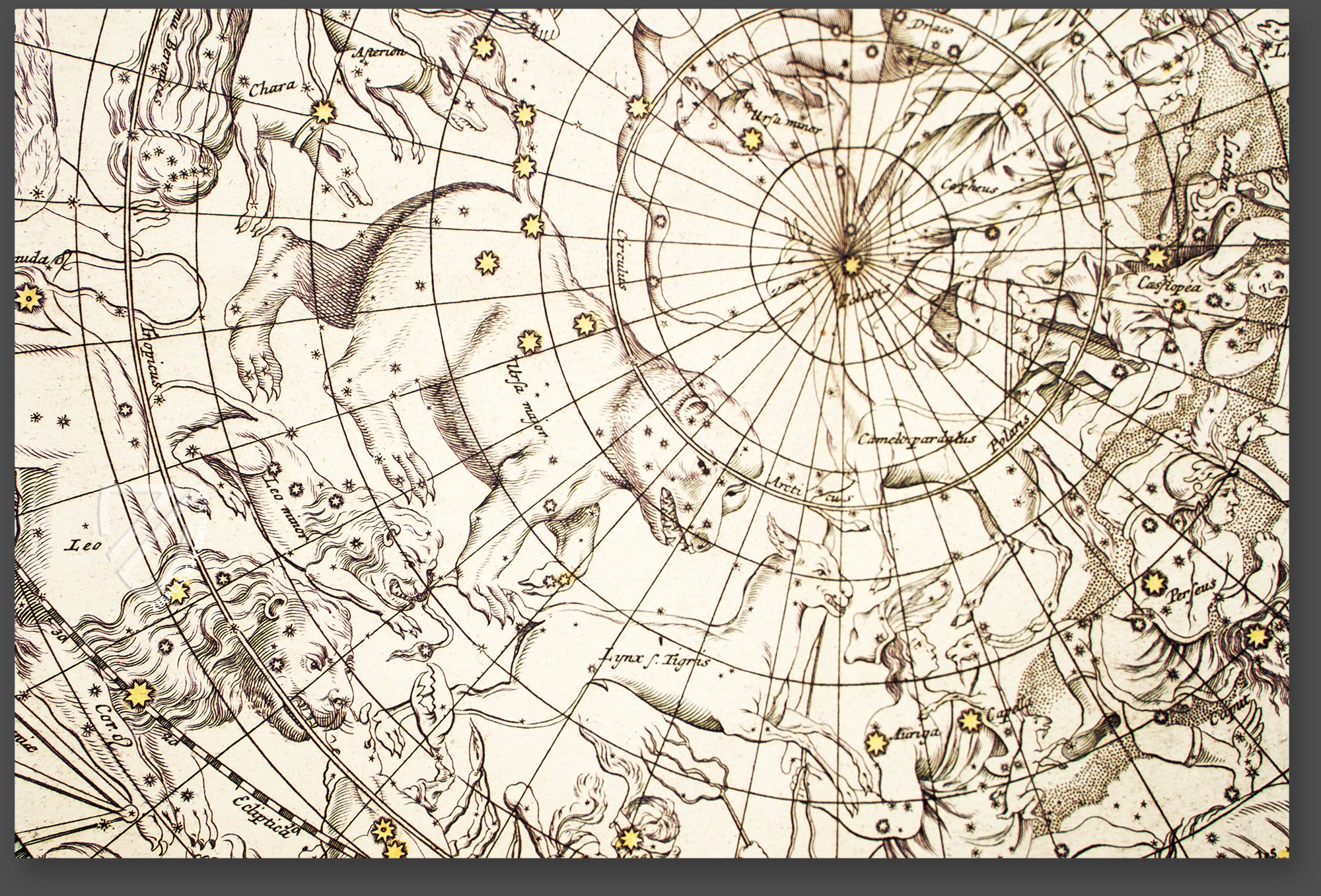 Der Stier stürmt entlang des Wendekreises des Krebses über den Himmel, die Hörner im Angriff gesenkt, seine beeindruckende Muskulatur wird durch zarte Schattierungen betont. Sein Angriff wird von Orion pariert, der in eine altgriechische Rüstung gekleidet ist, sich mit einem Schild behauptet und seine charakteristische Keule in die Höhe hält. Ihre Sterne sind mit Blattgold hervorgehoben. Das sind nur zwei der Sternbilder, die diesen Teil des Nachthimmels bevölkern und von Perseus, Widder, Lepus und Eridanus umgeben sind.