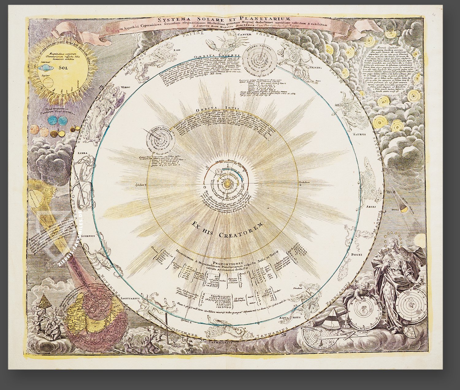 Weitere Informationen umgeben die Hauptdarstellung, wie z. B. ein Versuch, die relativen Größen der Planeten und der Sonne in der oberen linken Ecke zu vergleichen, mit der Darstellung einer Sonnenfinsternis darunter. Werkzeuge, die von Astronomen verwendet werden, sind in der unteren rechten Ecke neben zwei Figuren (Maria und einem Engel) dargestellt, darunter ein Fernrohr und ein Kompass.
