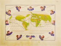 Die Karte wurde mit einer leuchtenden Farbpalette und goldener Tinte erstellt, wobei Europa ein spezielles orangerotes Kolorit erhielt, um es vom Rest der Alten Welt zu unterscheiden. Vier der Anemoi, der Windgötter, die jeweils einer Himmelsrichtung zugeordnet sind, umgeben den roten Rahmen, der vier verschiedene Muster in Gold für die vier Viertel der nördlichen Hemisphäre aufweist.