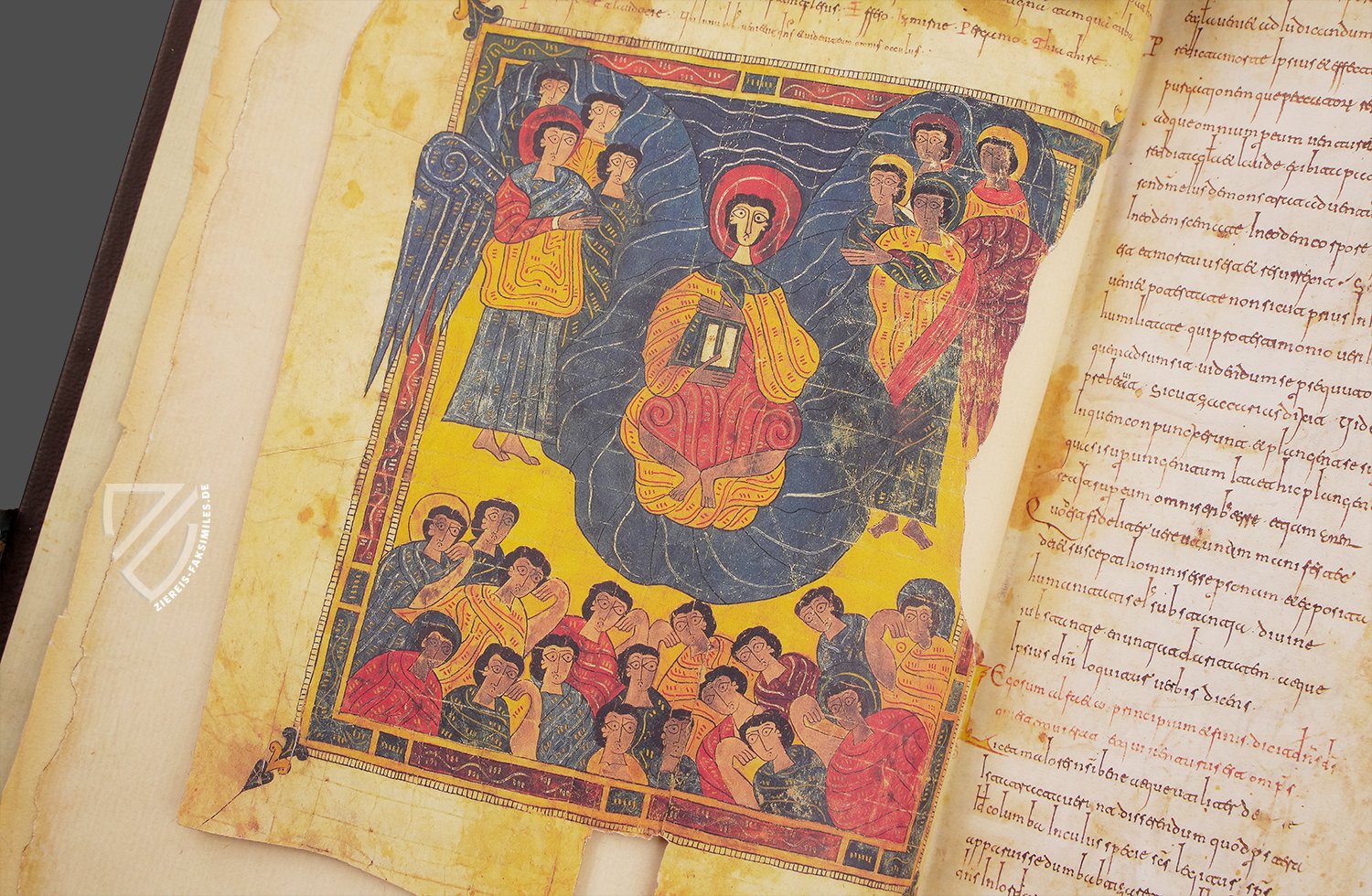 In der Bibliothek des berühmten Klosters San Lorenzo de El Escorial, das König Philipp II., ein großer Freund der schönen Künste, im 16. Jahrhundert erbauen ließ, wird ein wahrer Schatz der spanischen Beatus-Tradition bewahrt: der sogenannte Escorial-Beatus. Der beeindruckende Codex entstand vermutlich um das Jahr 950 im Skriptorium von San Millán de la Cogolla, das für seine herrlichen Beatus-Handschriften bekannt ist. Beatus von Liébanas einflussreicher Kommentar zur Offenbarung des Johannes wurde bereits im frühen Mittelalter zu einem eigenen Genre, das im Laufe des Mittelalters Dutzende von prächtigen Manuskripten hervorbrachte. Der Escorial-Beatus weist zudem einige ikonographische Besonderheiten auf, die die Lektüre und das Studium der herrlichen Miniaturen zu einem wahren Genuss machen. Ein Buchmaler namens Florentinus stattete den Codex mit 52 großen Miniaturen aus, die sich unter anderem durch ihre einfarbigen Hintergründe in leuchtenden Farben - meist Gelb - auszeichnen und Johannes Visionen in eine abstrakte Welt versetzen.
