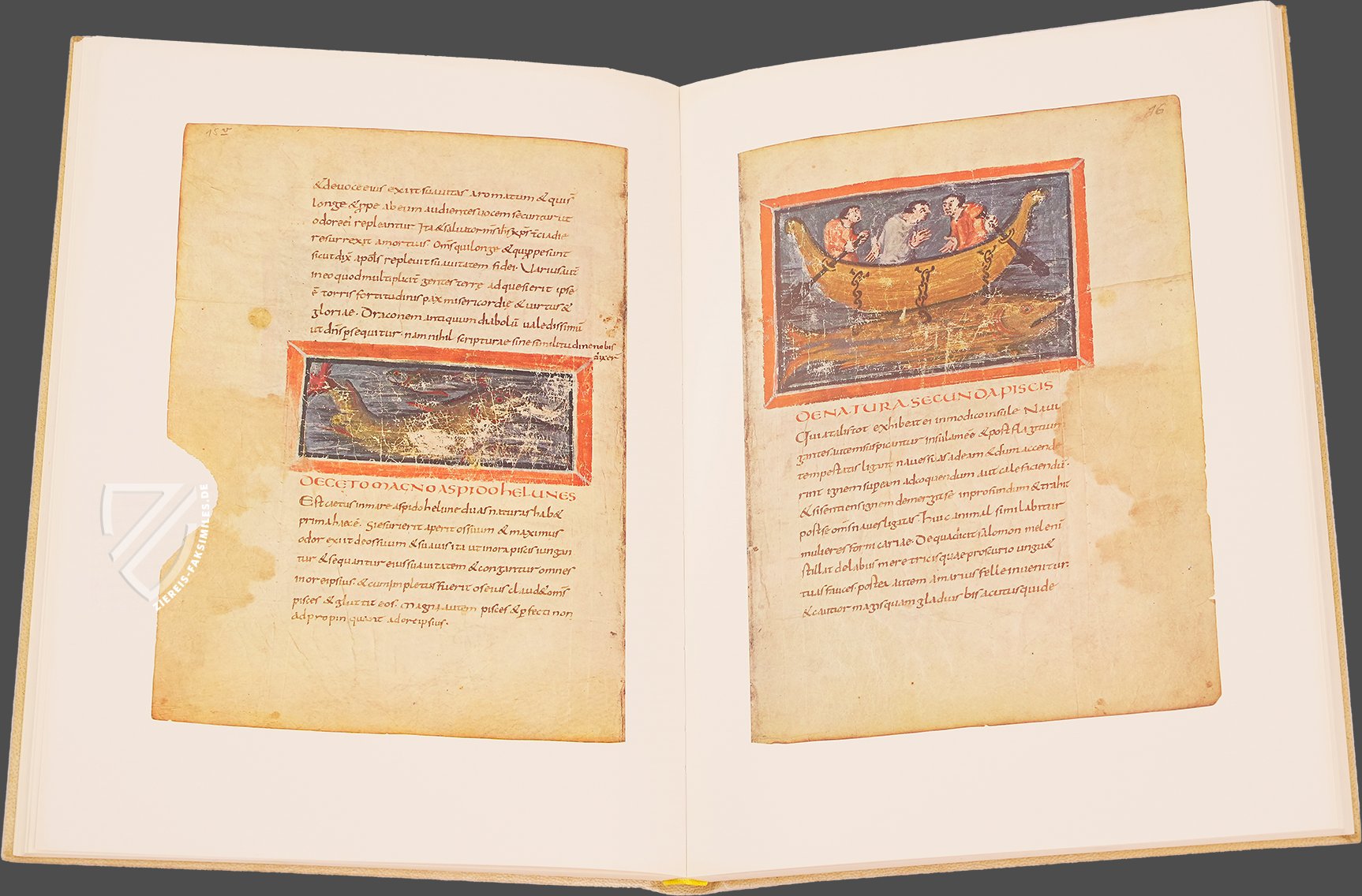 Der Physiologus ist ein didaktischer christlicher Text, der ursprünglich im 2. Jahrhundert in griechischer Sprache verfasst wurde und im Mittelalter sehr einflussreich für die Entwicklung der Bestiarien war - illustrierte Manuskripte, die verschiedene Tiere darstellen und ihnen moralische Lehren zuschreiben. Diese Art der christlichen Allegorie war sehr beliebt und bietet Einblicke in den Glauben und die Weltanschauung der Europäer im Mittelalter. Die älteste erhaltene illustrierte Version des Textes entstand zwischen 825 und 850 und ist das Werk eines Mönchs namens Haecpertus in der Abtei von Hautvillers. Nach dem Stil der feinen Miniaturen zu urteilen, die die Handschrift schmücken, muss es sich um die Kopie eines spätantiken Exemplars handeln. Sie hat 24 der ursprünglichen 35-50 Kapitel bewahrt, enthält aber auch zwei neue Kapitel über das Pferd und den Hahn, die aus Werken des Ambrosius von Mailand und Isidors von Sevilla stammen. Die Geschichte der Handschrift ist weitgehend ungeklärt, wahrscheinlich befand sie sich jahrhundertelang in einer Klosterbibliothek, bevor sie im 15. und 16. Jahrhundert in Privatbesitz gelangte und schließlich 1632 von der Burgerbibliothek Bern erworben wurde.
