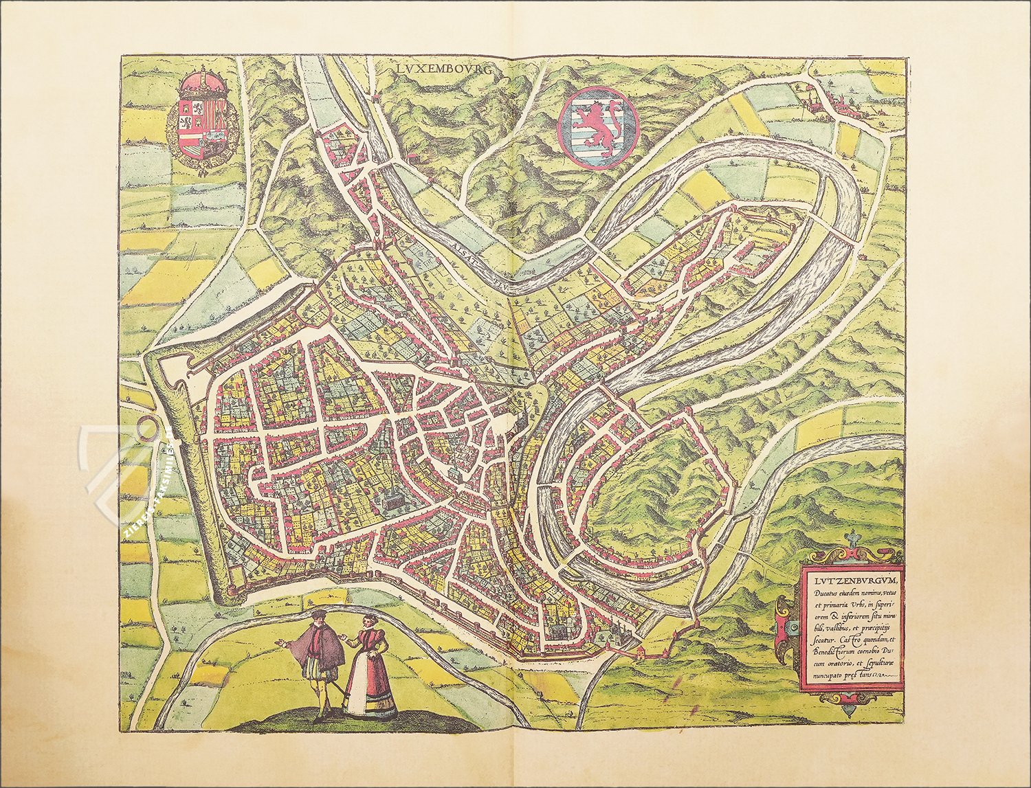 Diese Sammlung von Stadtansichten aus der ganzen Welt, einschließlich Europa, Asien, Afrika und sogar der Neuen Welt, gilt als das älteste Werk seiner Art. Das gewaltige sechsbändige Werk, das auch unter dem Titel Beschreibung und Contrafactur der vornembster Stät der Welt bekannt ist, wurde über einen Zeitraum von fast fünfzig Jahren zwischen 1572 und 1618 geschaffen und editiert. Es regt nicht nur den Geist an, sondern bietet auch dem Auge durch die liebevolle Gestaltung und künstlerische Ausführung der Karten einen grenzenlosen Genuss. Die Ausgabe von 1582 enthält 79 kolorierte Stadtansichten auf 59 Doppelfolio-Tafeln, darunter Verona, Chester, Zürich (mit der Bezeichnung Tigurum), Landshut, Luxemburg und Rotterdam.