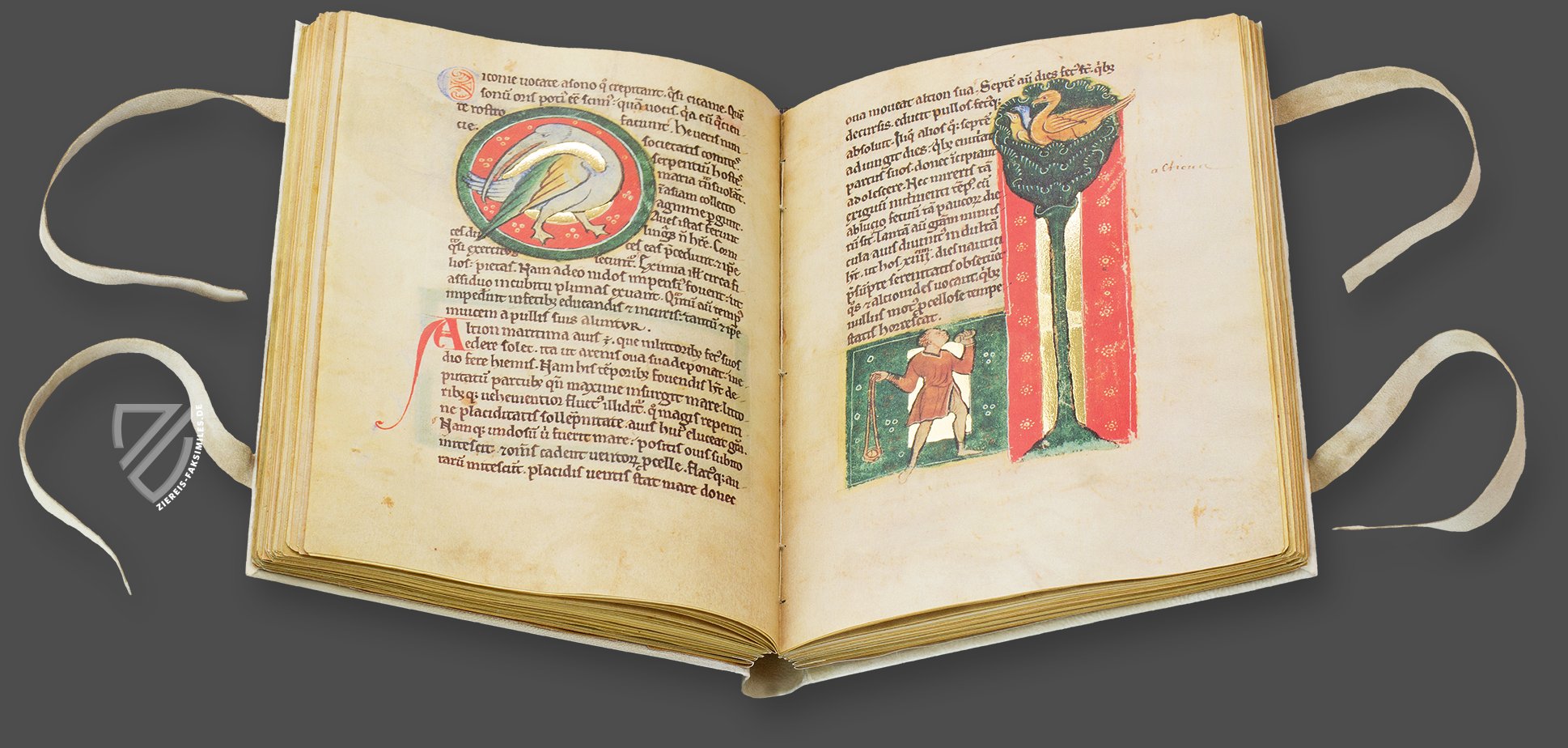 Die literarische Gattung des Bestiariums gehört in der mittelalterlichen Welt zu den beliebtesten Buchgattungen. Dabei handelt es sich um ein besonders reich bebildertes Werk der Tierliteratur, in dem Kreaturen aus dem Tierreich und der Fantasiewelt mit moralischen Eigenschaften belegt werden. Diese illuminierten Handschriften waren im England des 12. und 13. Jahrhunderts von besonders hoher Bedeutung. Das Bestiarium aus St. Petersburg ist eines der schönsten und kostbarsten Beispiele für diese Codices. Es ist außerordentlich reich mit 114 farbenfrohen Miniaturen (darunter 4 ganzseitige) geschmückt, von denen die meisten vor einem erhabenen Hintergrund aus Blattgold stehen. Zusätzlich zu den Tierdarstellungen ist das Werk mit einem Bilderzyklus der Schöpfungsgeschichte ausgestattet. Auch wenn die Handschrift eindeutig aus England stammt, ist sonst nur wenig über ihren Ursprung bekannt, und selbst die Bestimmung der Quelle ihrer Ikonographie ist schwierig. Dennoch dürfte sie um 1190 in einem Kloster in den nördlichen Midlands entstanden sein.