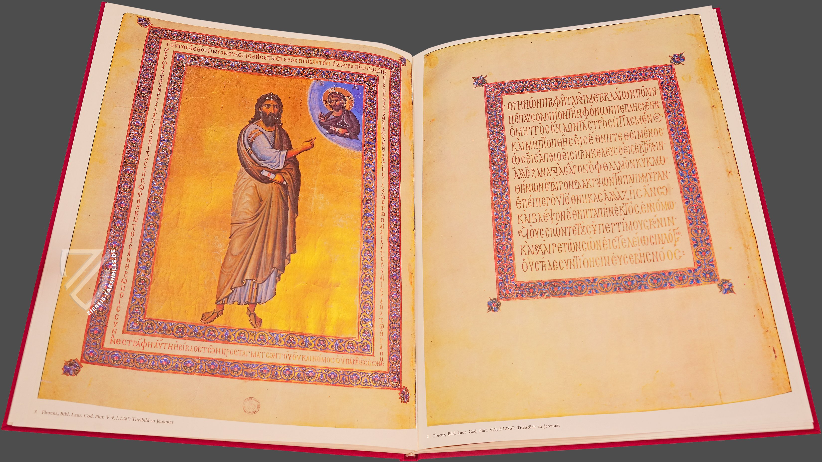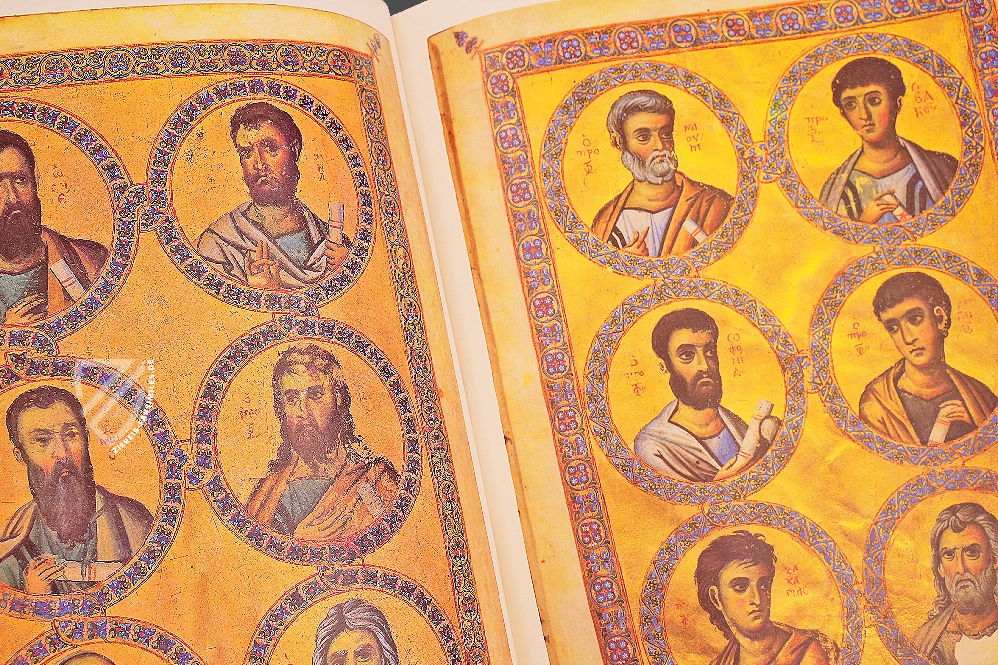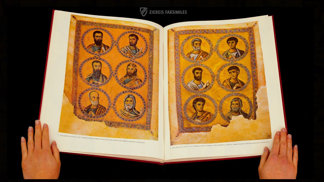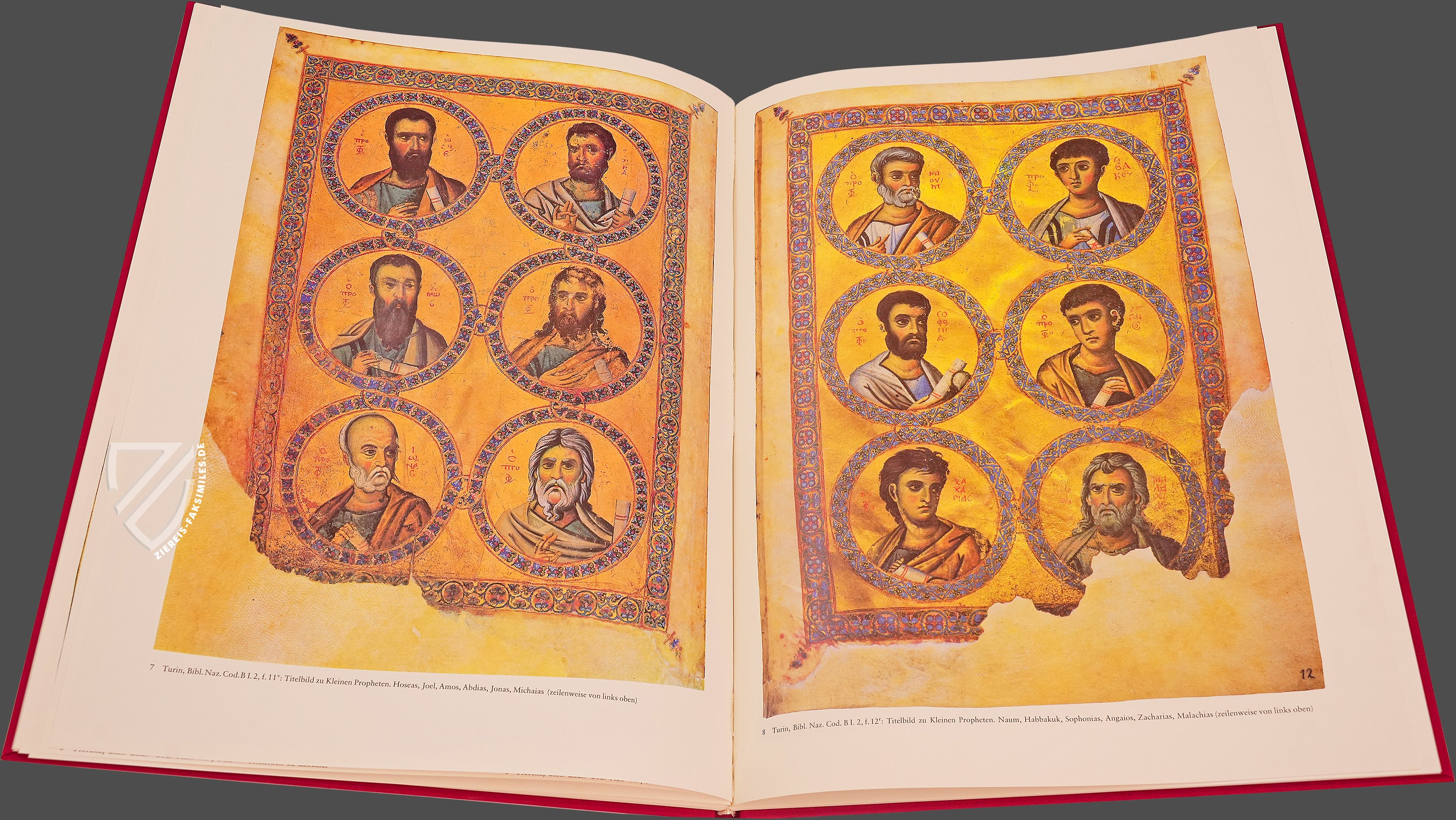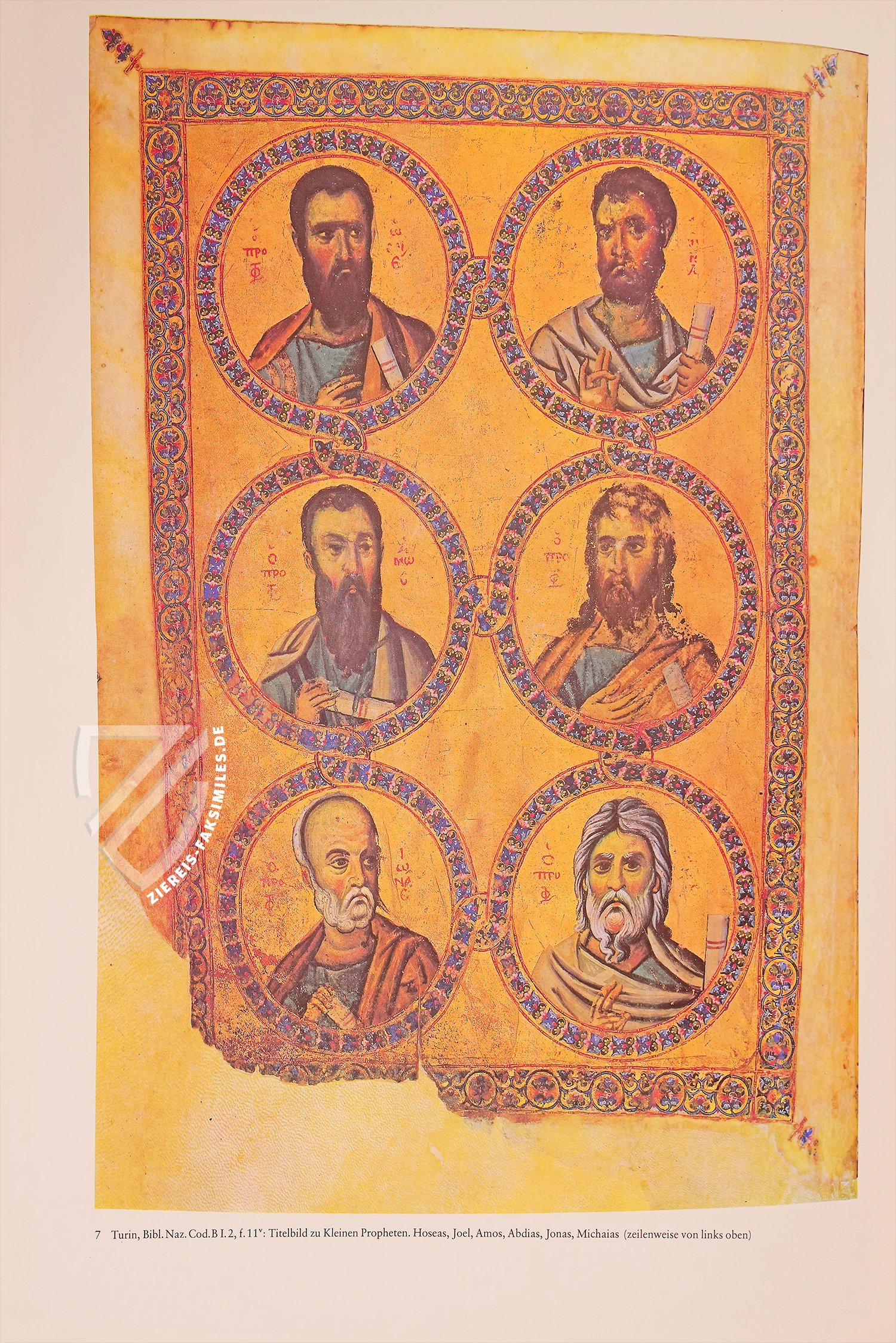 Das Turiner Fragment der prächtigen Bibel des Niketas enthält das sogenannte Zwölfprophetenbuch, das die Schriften der zwölf „Kleinen“ Propheten umfasst. Die opulent illuminierte Titelseite, die dieses biblische Buch einleitet, zeigt die ersten sechs von ihnen – entsprechend der kanonischen Reihenfolge: Hosea, Joel, Amos, Obadja, Jona, Micha (von links oben nach rechts unten).