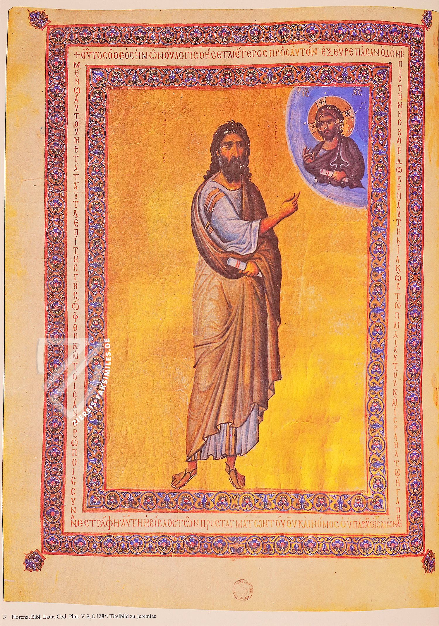 In diesem Titelbildnis zum Buch Jeremia erhält der biblische Prophet seinen Auftrag und seine Inspiration von Gott. Die Szene trägt sich vor einem prächtigen, goldenen Hintergrund zu, der bereits andeutet, dass hier göttliches, transzendentales geschieht. Gott selbst erscheint, ausgezeichnet mit einem Kreuznimbus, in einer blauen Sphäre, die ihn im Himmel verortet. Beide Figuren kommunizieren über ihre Blicke und Gesten und halten jeweils eine identische Schriftrolle in der linken Hand – ein Zeichen dafür, dass Jeremias Schriften von Gott höchstpersönlich stammen.