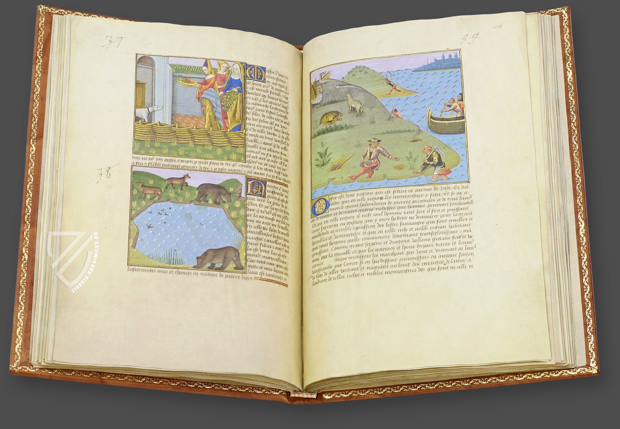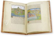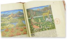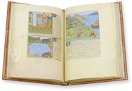 Beginnend mit der schönen „E“-Initiale in Blau, Rot und Gold, kann am Anfang der Passage des französischen Textes das Wort „Egypte“ gelesen werden. Die wunderschöne Landschaft zeigt die Tiere des antiken Landes. In den im Vordergrund blauen Fluss, vermutlich der Nil, sind zunächst Wellen gemalt. Dann geht er aber auf seinem Weg zum Meer in ein glänzendes Silber über; dort erwartet ihn ein Schiff.