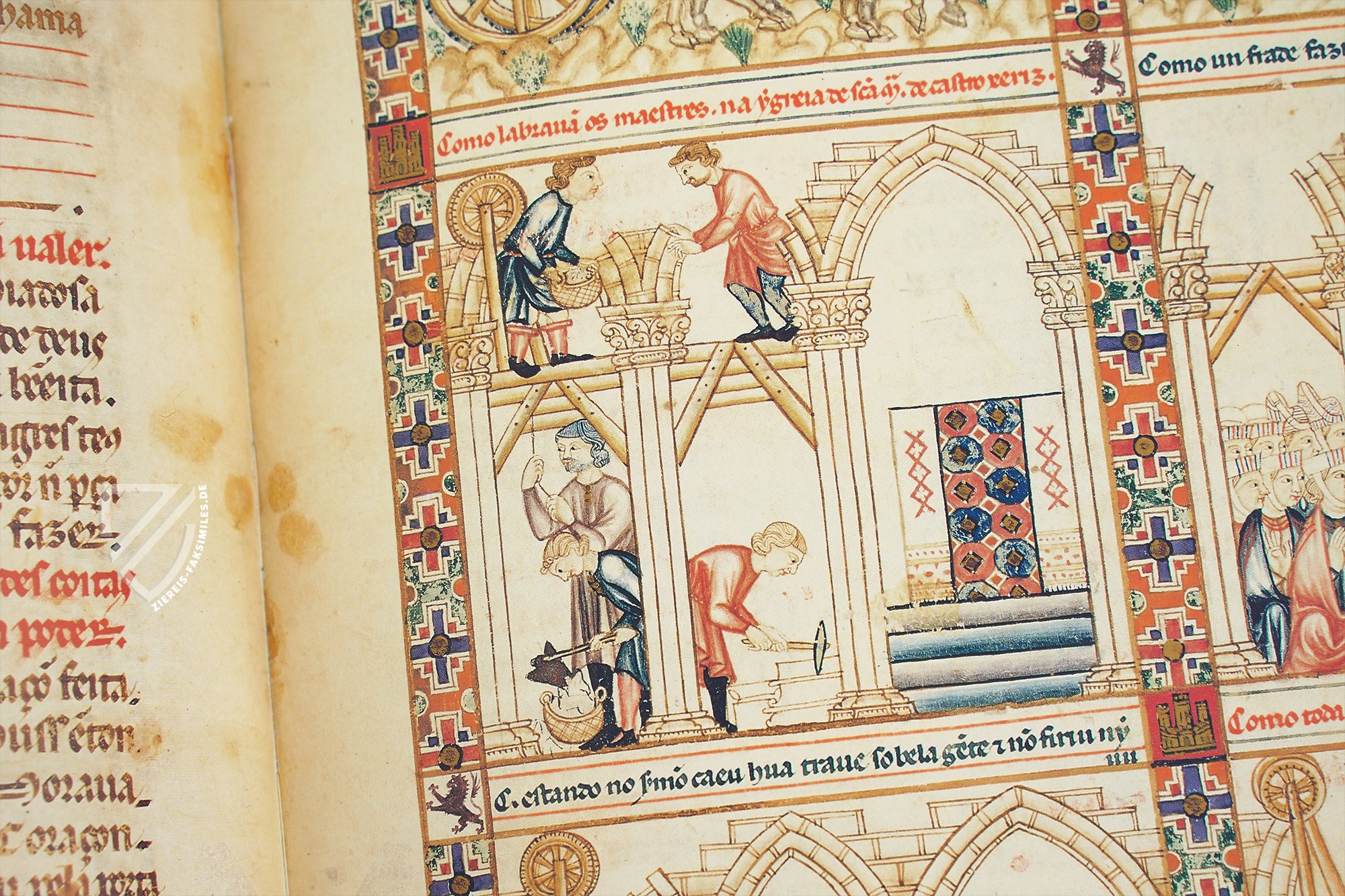 Alfons X. der Weise (1221–1284) trägt seinen Beinamen mit vollem Recht: Er bemühte sich um universale Bildung für sich persönlich und förderte zugleich Kunst und Wissenschaft an seinem Hof in einem bewundernswerten Ausmaß. Ein Produkt seiner Leidenschaft für Bildung und Kultur ist die vorliegende Sammlung von 420 galizischen Gedichten, meist mit Notationslinien, die alle inhaltlich der Verehrung Marias dienen, deren Takt aber unterschiedlicher nicht sein könnten. Alfons gab nicht eine bloße Sammlung von Liedern in Auftrag, sondern ein bedeutungsvolles Kulturprojekt für Literatur, Musik und Kunst: Die Miniaturen geben technisch detailliert zeitgenössische Musikinstrumente wieder und gestalten zugleich auch Mimik und Körperhaltung der Musiker in lebendiger Kommunikation untereinander. Dass einige Miniaturen nicht ganz fertiggestellt werden konnten, erlaubt heute spannende Einblicke in den Arbeitsprozess mittelalterlicher Illuminatoren.