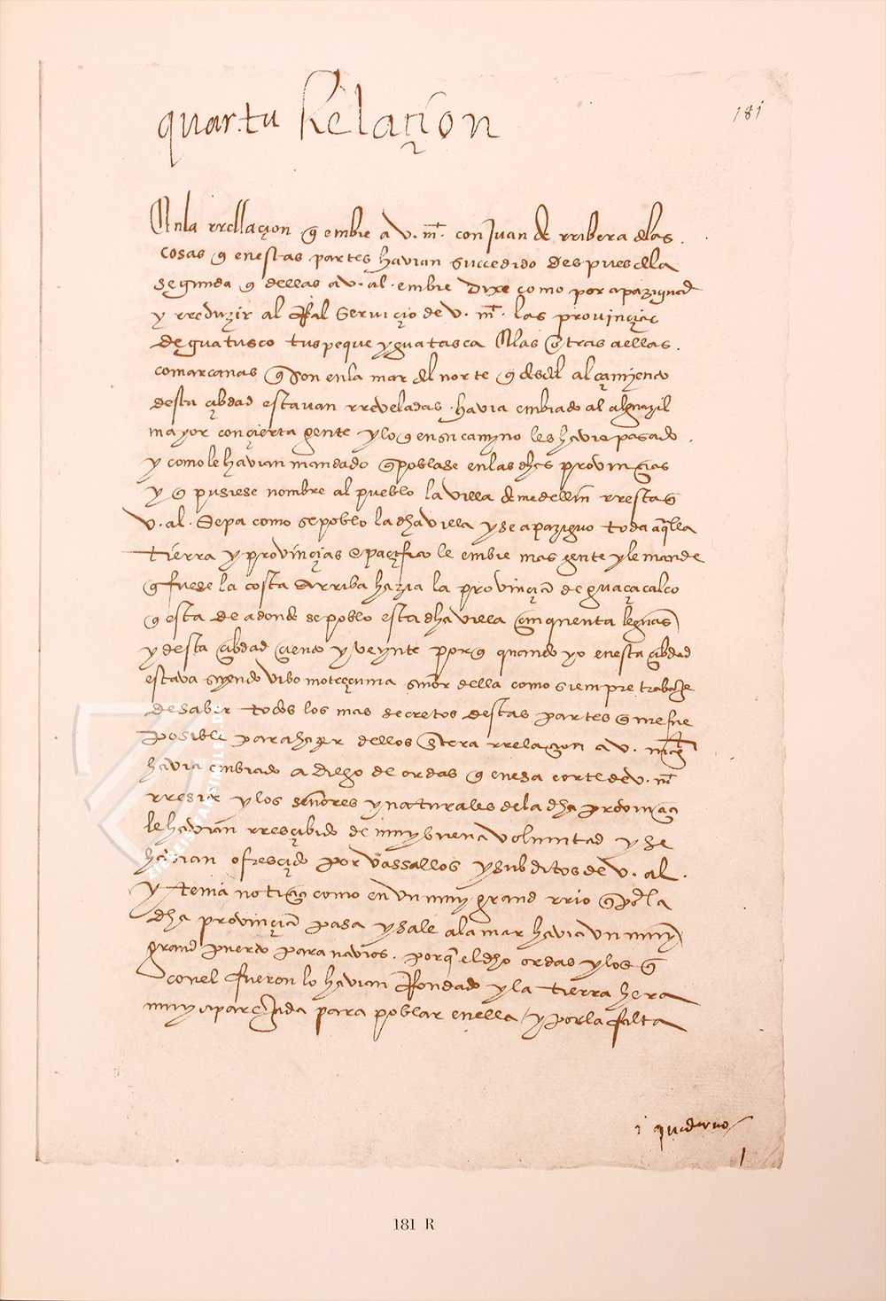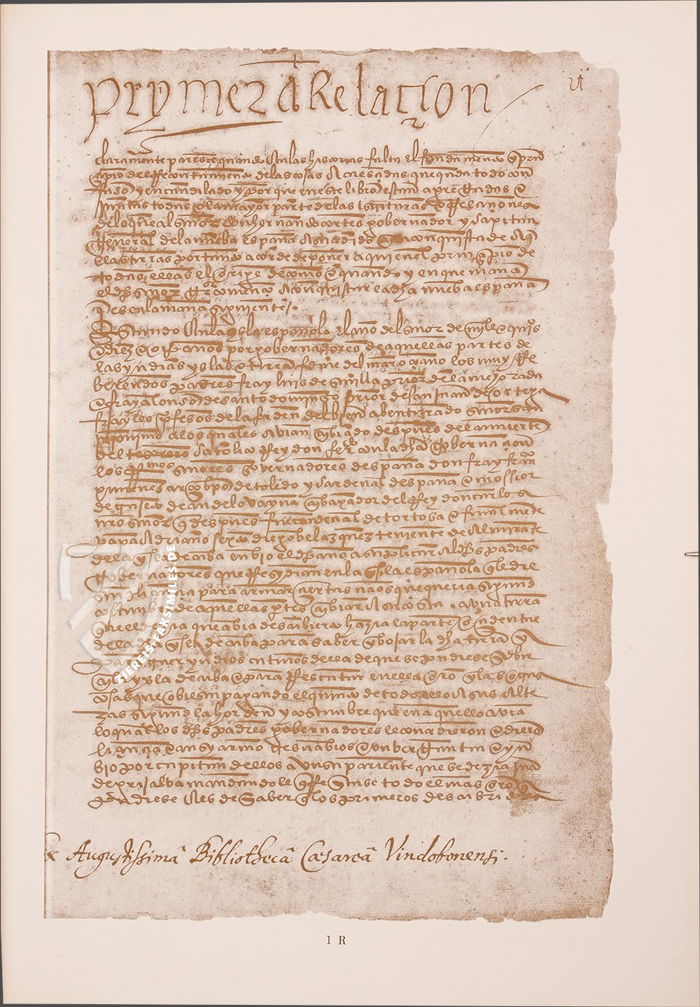 Die Ăsterreichische Nationalbibliothek besitzt mit der Handschrift mit der Signatur Codex Vindobonensis S. N. 1600 einen groĂen Schatz: Es handelt sich um die Cartas de Relacion de la conquista de la Nueva Espana, einen Sammelband mit den sogenannten relaciĂłnes einiger Conquistadoren und anderer wichtiger Persönlichkeiten des frĂŒhen spanischen Kolonialismus sowie einigen wichtigen offiziellen Dokumenten. Dieser stattliche Band der Cartas de Relacion de la conquista de la Nueva Espana enthĂ€lt die fĂŒnf sogenannten Relaciones von HernĂĄn CortĂ©s, zwei Relaciones von Pedro Alvarado, die RelaciĂłn von Diego de Godoy, den Bericht ĂŒber die Reise von Francisco Pizarro und Diego Almagro, die Botschaft, die Antonio Giral an Alvaro de Saavedra Ceron ĂŒberbrachte, und das Patent, welches die ursprĂŒnglich zwölf Franziskanermönche ermĂ€chtigte, nach Mexiko zu kommen. Diese Schilderungen aus erster Hand machen diesen Sammelband zu einer unvergleichlichen Quelle ĂŒber die Zeit der Eroberung, die das spanische Reich in der Neuen Welt schuf.