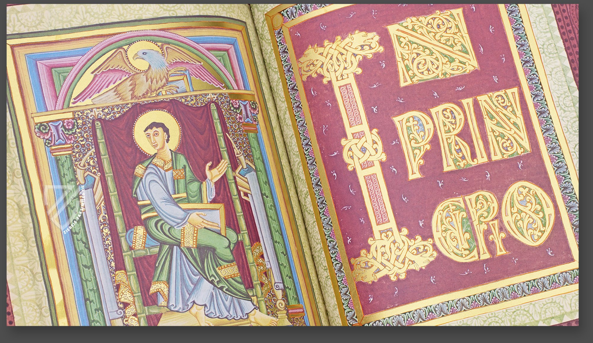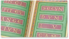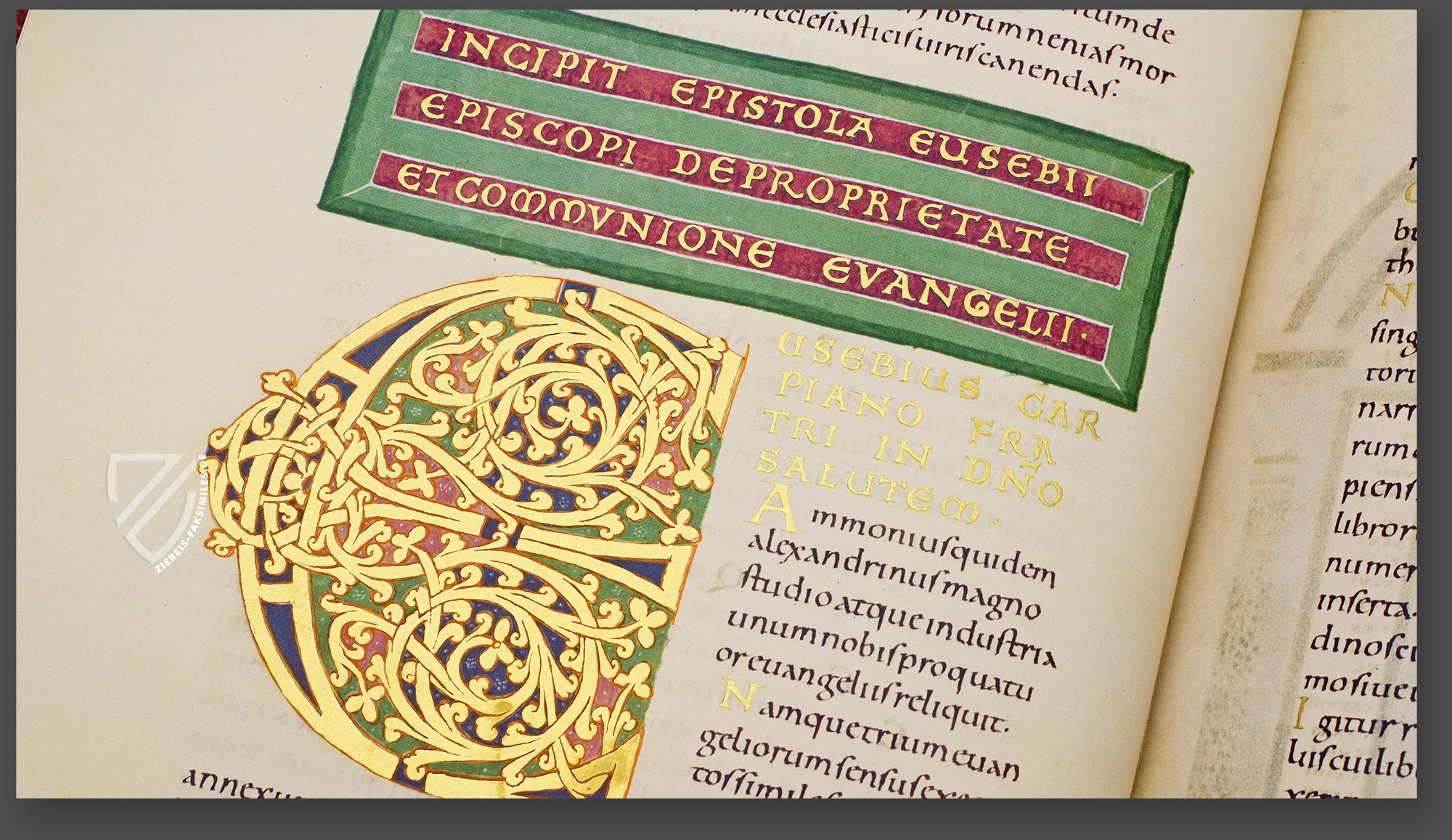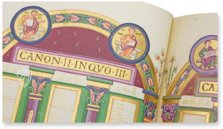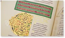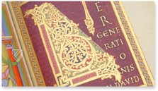 - 12 überaus prächtige Kanontafeln; 2 kunstvolle Teppichseiten; 6 ganzseitige, reich mit Gold geschmückte Miniaturen; 6 ganzseitige Prunkinitialen auf Goldgrund; 16 ganz- und halbseitige mit Gold hinterlegte Textprunkseiten und ungezählte Goldinitialen