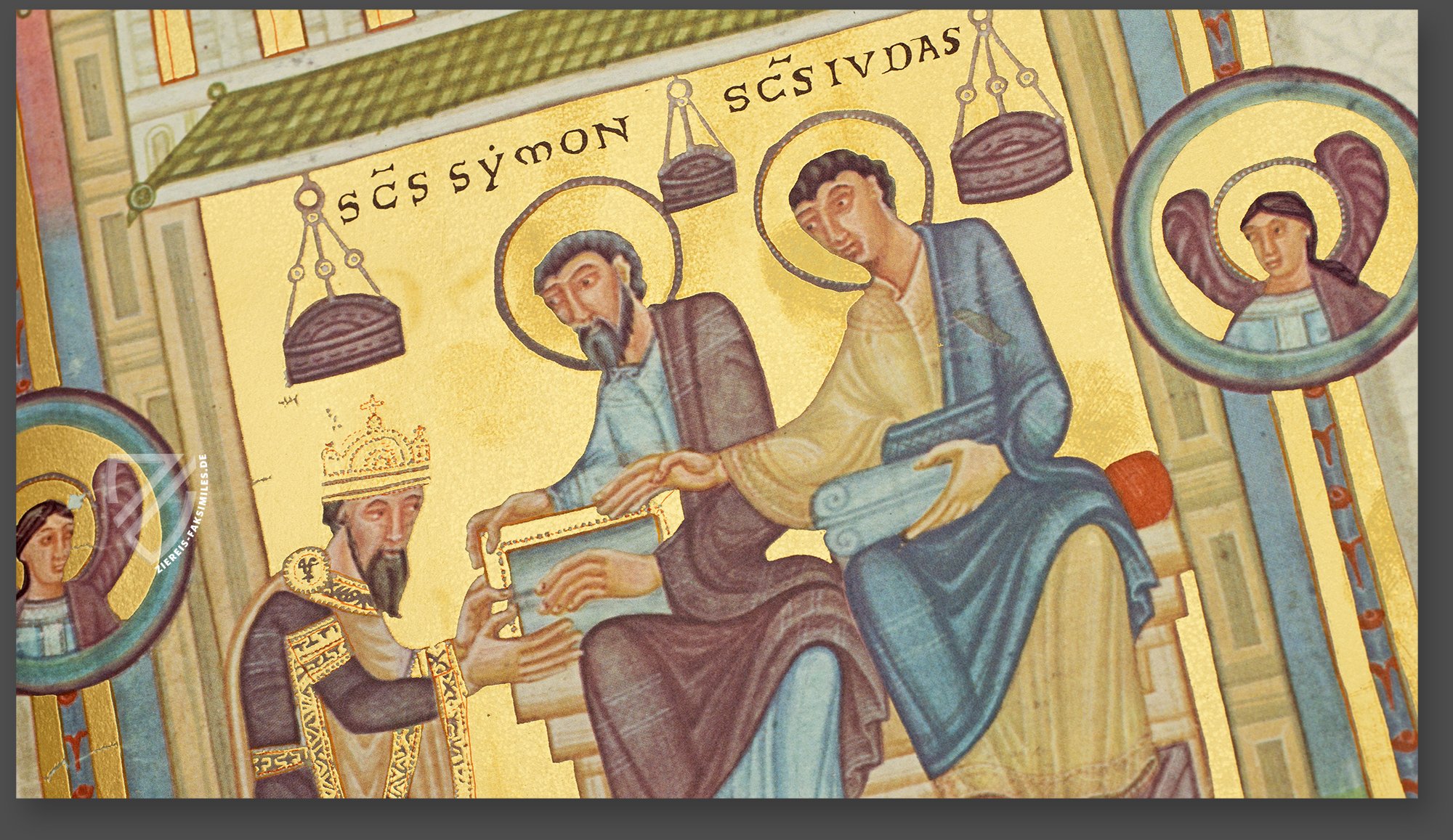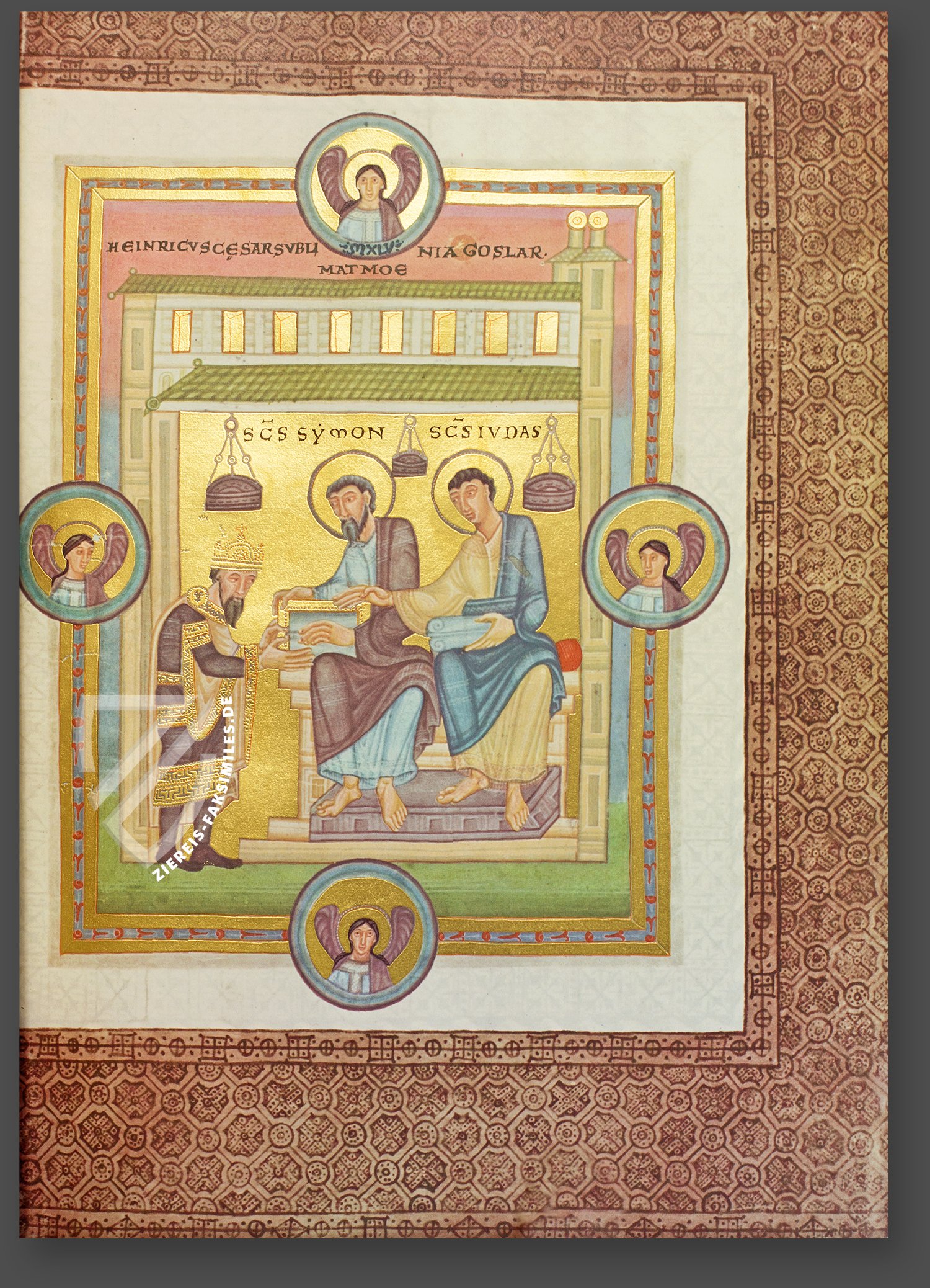 Gekleidet in kaiserlichem Purpur mit goldenem Tuch überreicht Heinrich III. die vorliegende Handschrift an die Heiligen Simon und Judas, die Schutzheiligen des Goslarer Doms, die unter einem grünen Ziegeldach sitzen. Sie sind barfuß, um ihre Frömmigkeit zu betonen, und in traditionelle römische Togas gekleidet. Das Kunstwerk ist auffällig byzantinisch gestaltet, vor allem durch den brünierten Goldhintergrund und die vergrößerten Hände, die ihre Gesten betonen.