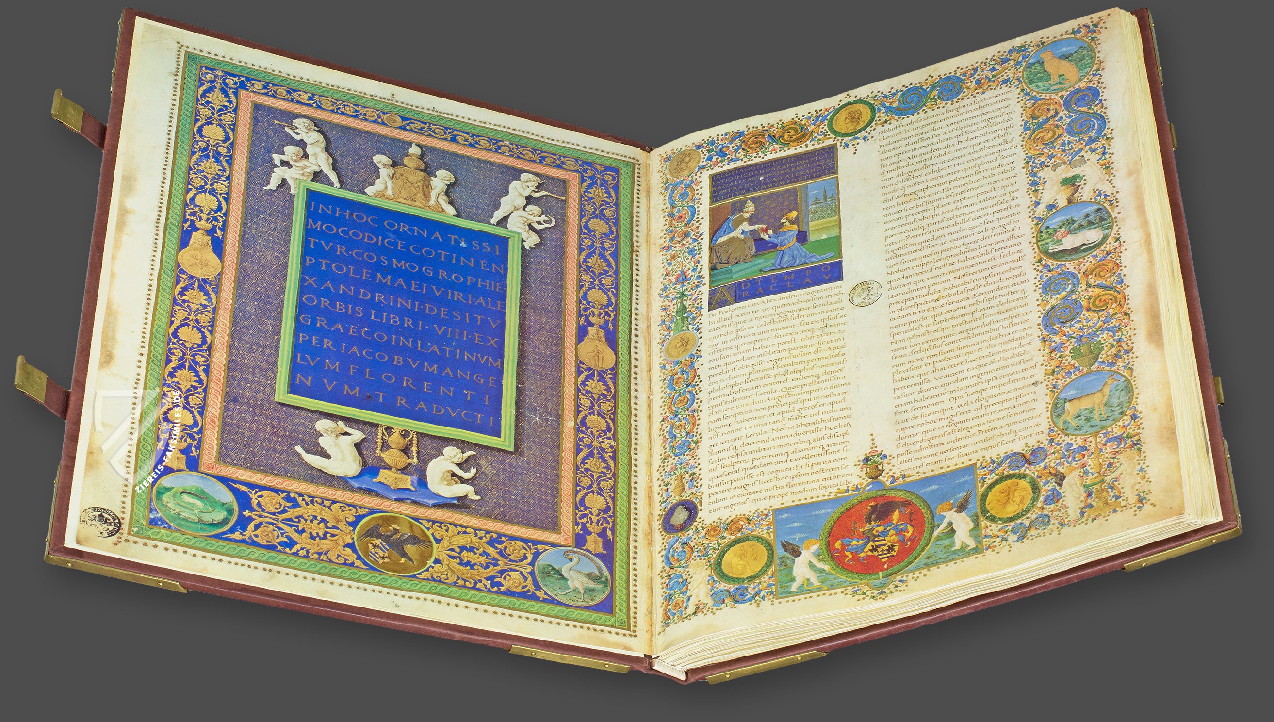 Die Cosmographia des Claudius Ptolemäus ist ein Weltatlas, der 1472 in Italien entstanden ist. Er ist eine Neugestaltung der Kosmografie des antiken griechischen Gelehrten Ptolemäus und enthält 44 geografisch korrekte Karten, von denen 29 eine Doppelseite einnehmen. Viele Textseiten sind mit zahlreichen farbigen und goldenen Miniaturen und Darstellungen in Bordüren kunstvoll verziert. Wie alle kosmografischen Werke verbindet es Geografie, Geologie und Astrologie und geht auch auf die historischen, spirituellen und moralischen Aspekte der mittelalterlichen Weltanschauung ein. Die großformatigen Karten und anderen farbenfrohen und goldgeschmückten Darstellungen wurden von talentierten Künstlern der italienischen Renaissance wie Francesco Rosselli und Pietro del Massaio gestaltet. In Auftrag gegeben wurde das prächtige Manuskript 1471 von Federico da Montefelatro, Herzog von Urbino, einem berühmten Staatsmann, General und humanistischen Kunstmäzen.