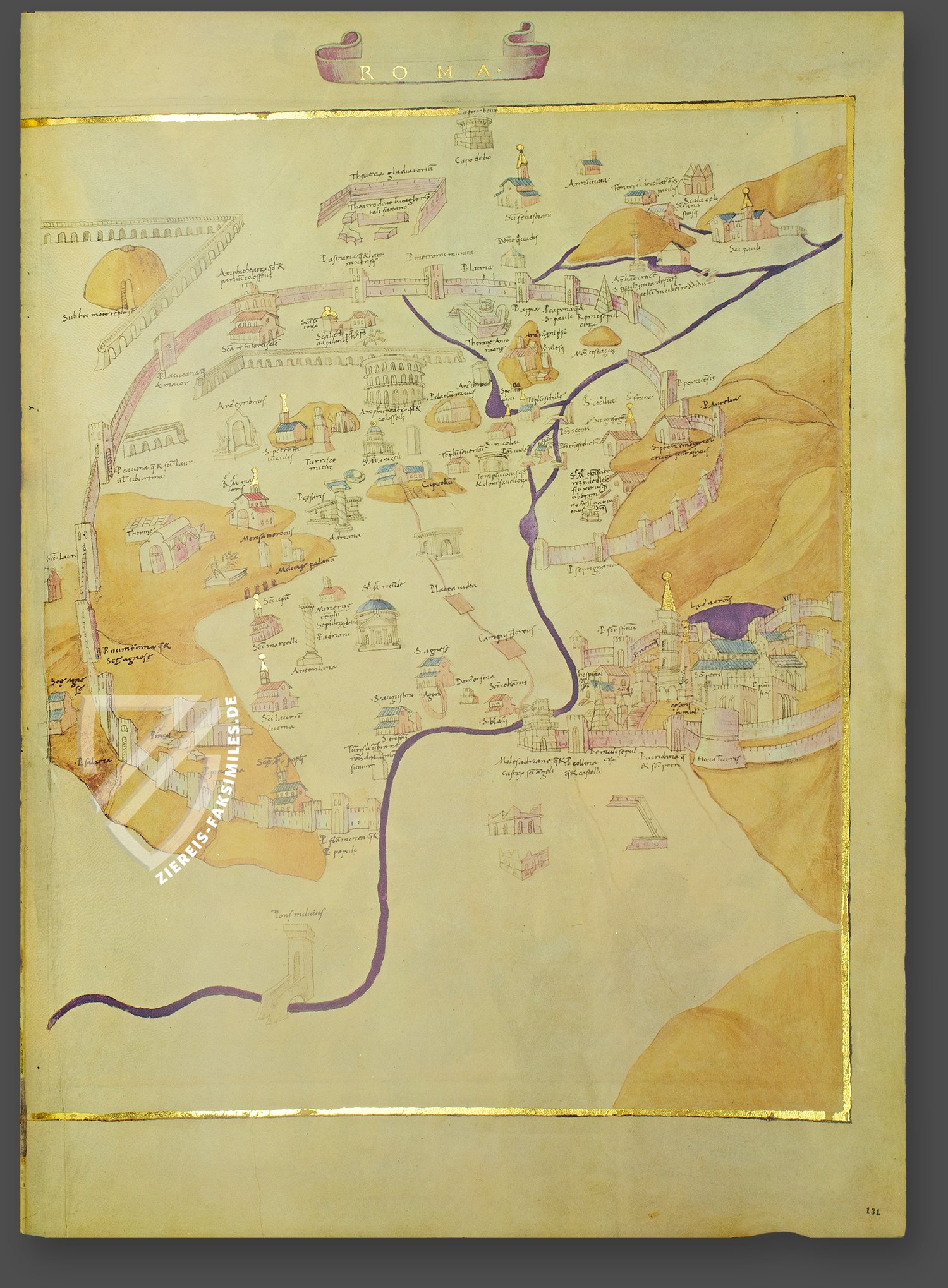 Das mittelalterliche Rom, benannt mit einer Banderole in Goldschrift, präsentiert sich hier in einem eleganten und zugleich einfachen Rahmen, der ebenfalls in poliertem Gold gehalten ist. Die Miniatur zeigt die sieben Hügel Roms, den Tiber in Dunkelblau und die Überreste des Aquädukts sowie verschiedene Kirchen und Denkmäler aus der Antike, die mit winzigen Buchstaben beschriftet sind.