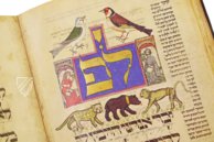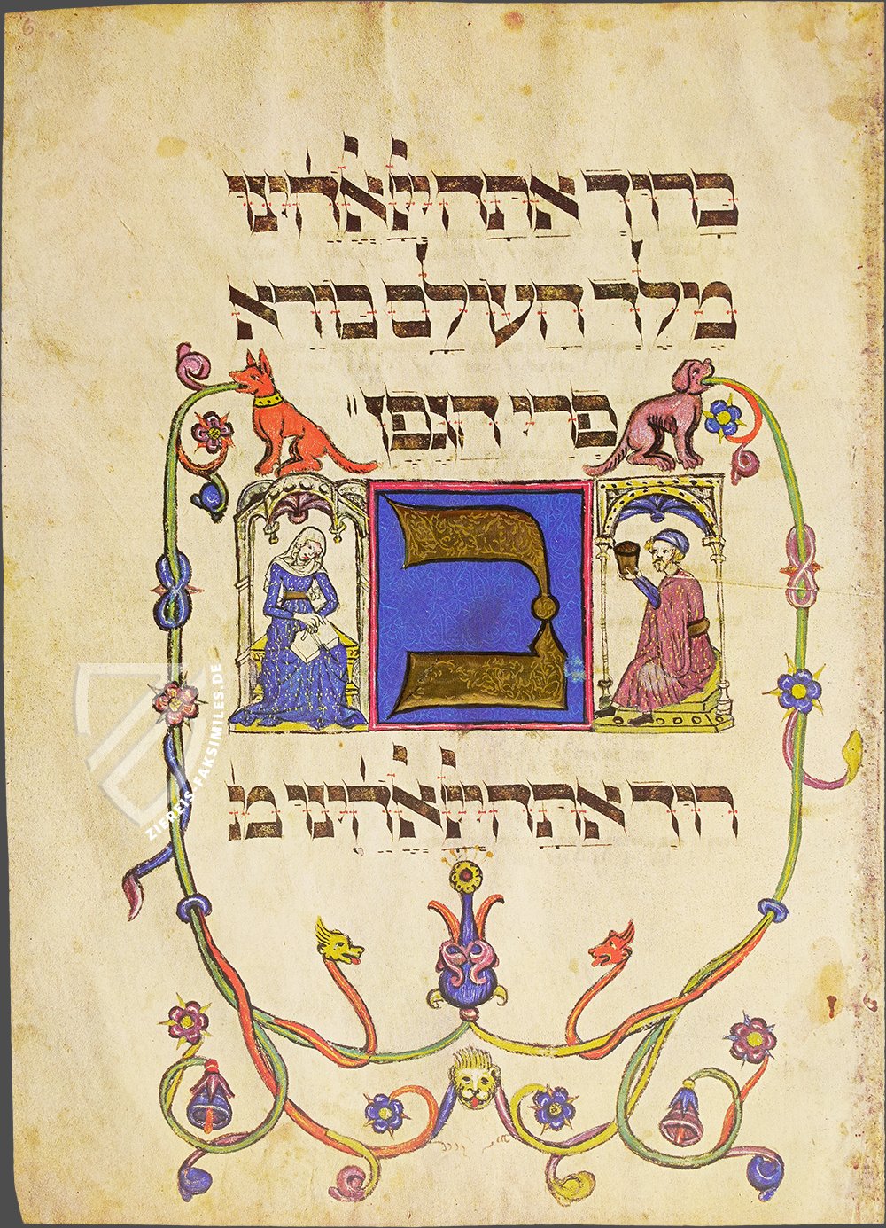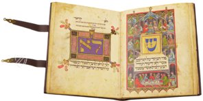 Diese feine aschkenasische Haggadah aus der Zeit um 1430 zeichnet sich nicht nur durch die Raffinesse ihrer Schrift oder die Schönheit ihrer Miniaturen aus, sondern auch durch ihren ungewöhnlichen Inhalt: Sie umfasst nĂ€mlich eine Sammlung von biblischen und homiletischen Versen, Gebeten, Gedichten, religiösen BrĂ€uchen und Liedern, die sich hauptsĂ€chlich auf das Buch Exodus und die Befreiung aus der Ă€gyptischen Knechtschaft beziehen. Obwohl sich der begabte Schreiber im Text als Israel ben Meir aus Heidelberg zu erkennen gibt, bleibt der KĂŒnstler, der fĂŒr die rĂ€tselhafte und manchmal geheimnisumwobene Bildsprache der Handschrift verantwortlich ist, anonym. Zu ihren Darstellungen gehören MĂ€nner und Frauen, die gemeinsam BĂŒcher halten, Frauen mit unbedecktem Kopf, eine Jagdszene und eine Darstellung des Jungbrunnens mit nackten MĂ€nnern und Frauen beim Baden. Das Manuskript ist mit 2 ganzseitigen Miniaturen und 24 gerahmten dekorativen Initialseiten geschmĂŒckt, von denen einige menschliche und tierische Figuren zeigen.