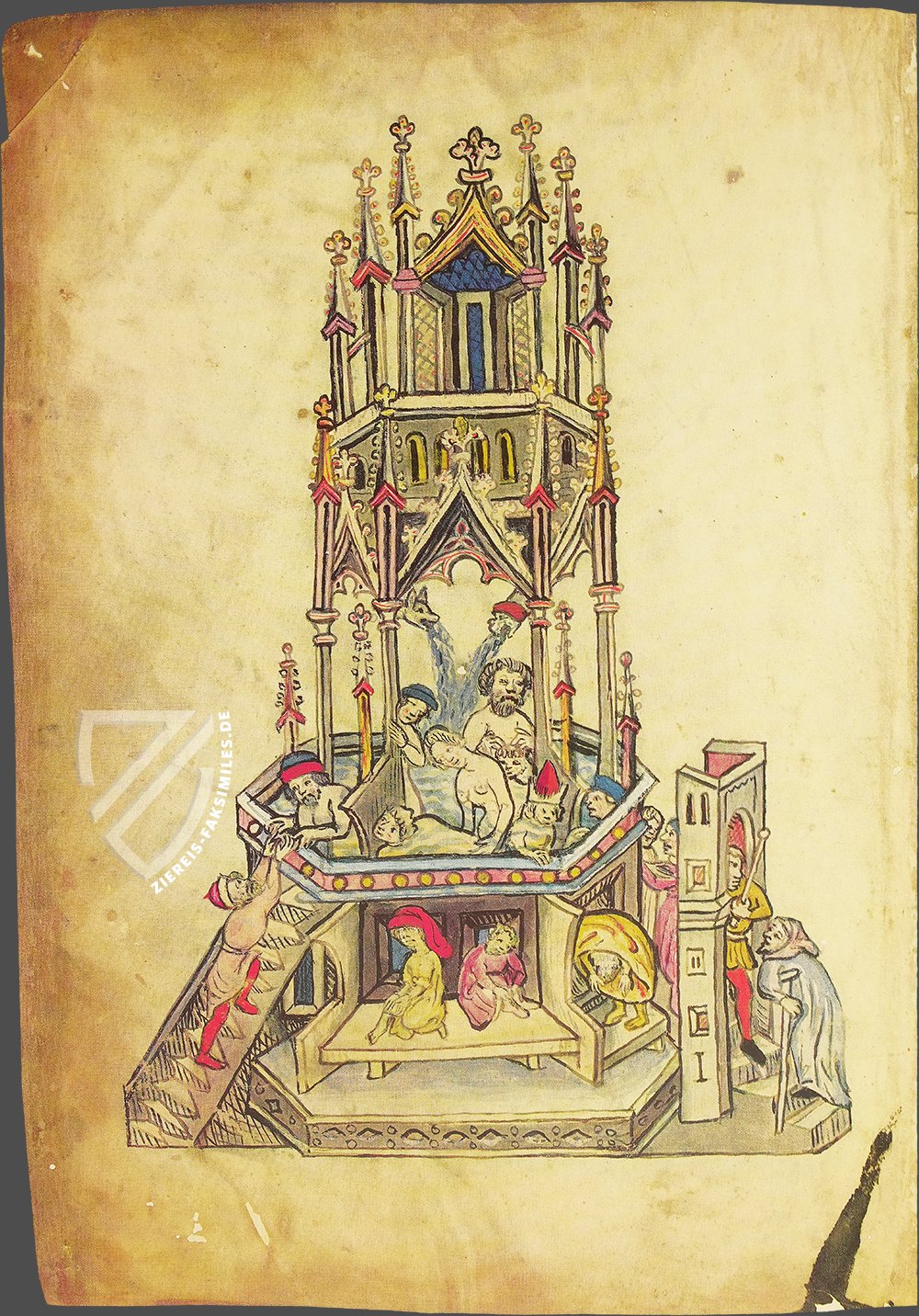 Diese Miniatur zeigt MĂ€nner und Frauen beim Baden im Jungbrunnen, einem im SpĂ€tmittelalter beim weltlichen Adel beliebten kĂŒnstlerischen und philosophischen Thema. Die Miniatur erscheint am Ende des Manuskripts zusammen mit einer Jagdszene, die in einer Haggada eigentlich ebenso fehl am Platz ist (gejagtes Fleisch ist nicht koscher). Ein Mann mit einer KrĂŒcke betritt ein Tor auf der rechten Seite und sucht das heilende Wasser, das durch zwei ZuflĂŒsse in Form von Tierköpfen gespeist wird, wĂ€hrend sich Menschen vor dem gotischen Brunnen entkleiden.