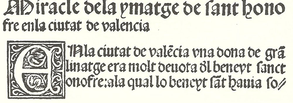Diese valencianische Hagiographie, die 1520 von Jorge Costilla gedruckt wurde, beschäftigt sich mit dem Leben des heiligen Wßstenvaters Onophrios aus dem 4./5. Jahrhundert ("San Onofre" auf Spanisch) und wird von einem faszinierenden Holzschnitt eingeleitet. Der Legende nach traf der Asket Paphnutius auf Onophrios, nachdem er 17 Tage lang durch die ägyptische Wßste gewandert war und darßber nachgedacht hatte, ein Eremit zu werden.