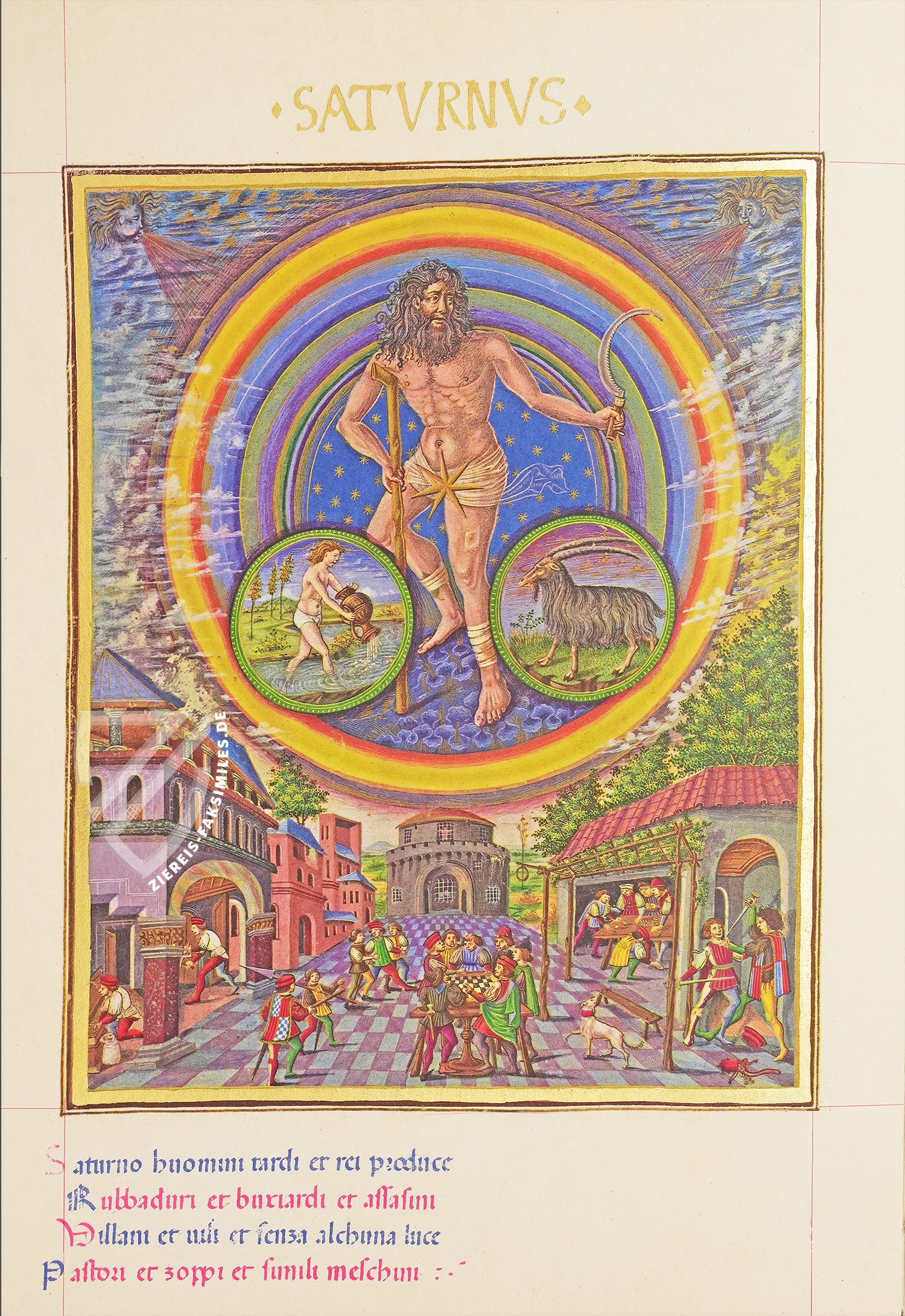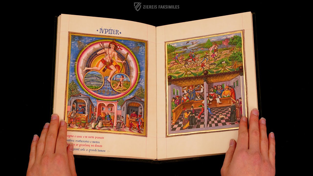 Diese Miniaturen gehören zu den schönsten des 15. Jahrhunderts und vereinen zeitgenössisches Wissen über die Sterne mit der Ikonografie des Tierkreises und mit Szenen aus dem Alltag. In einem Ring konzentrischer Regenbogenkreise sehen wir Jupiter, der mit Pfeilen und Zepter in der Hand und einem Köcher über der Schulter abgebildet ist. Zu seinen Füßen sind die Tierkreiszeichen von Fisch und Schütze in Medaillons dargestellt.