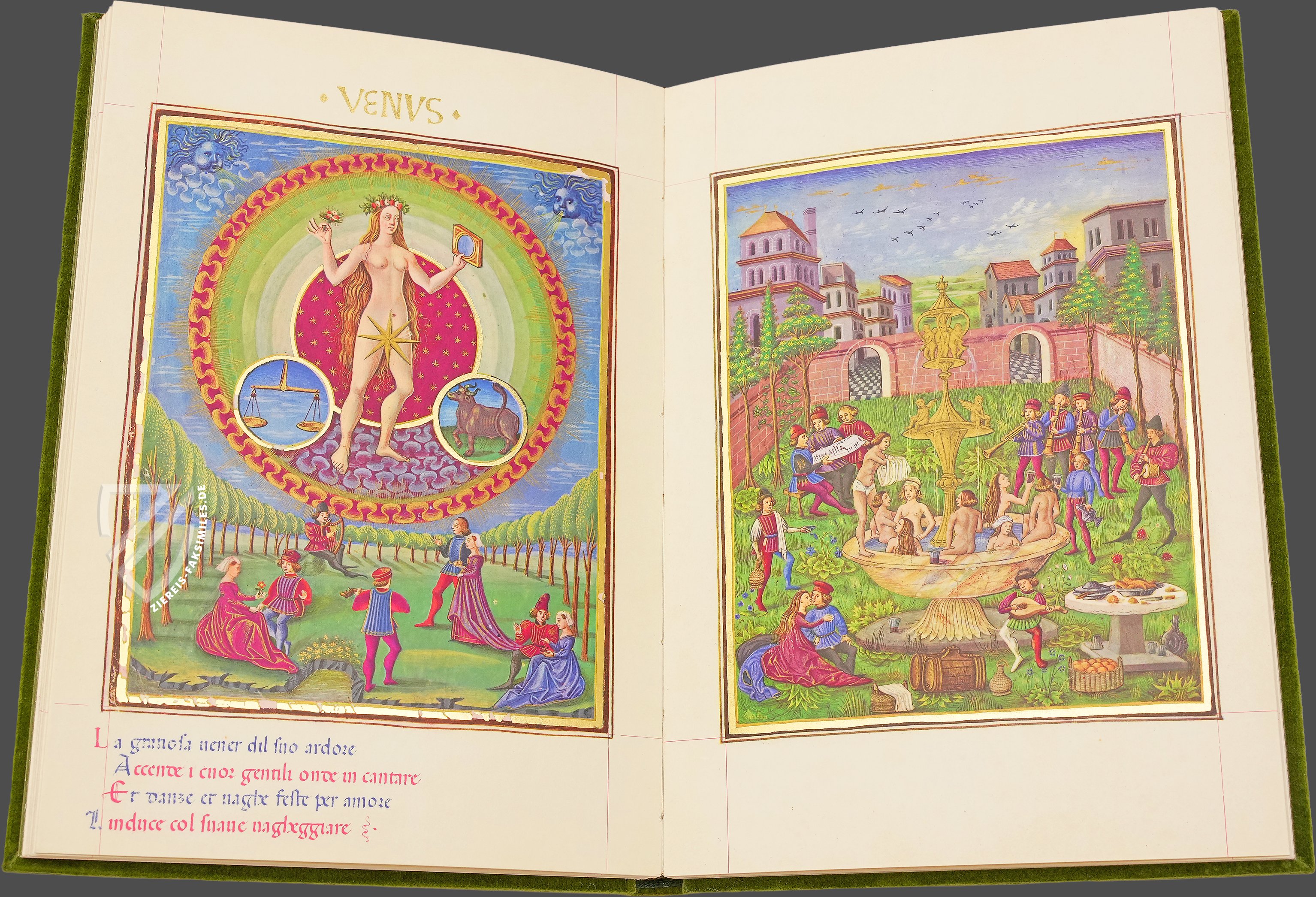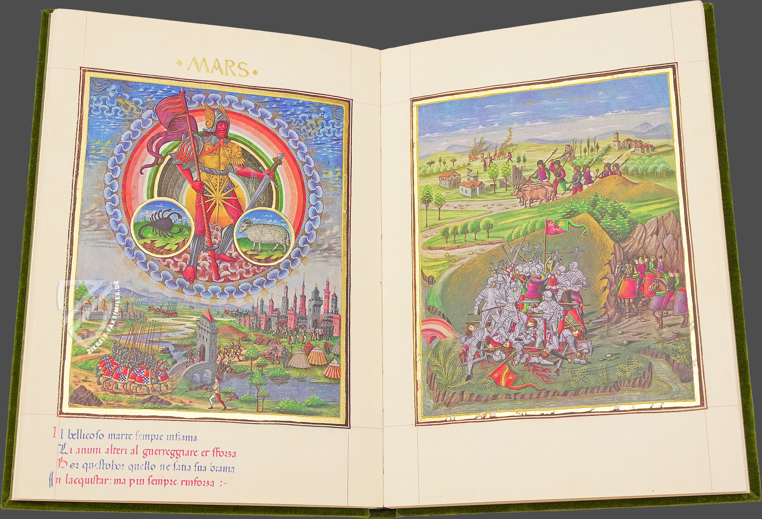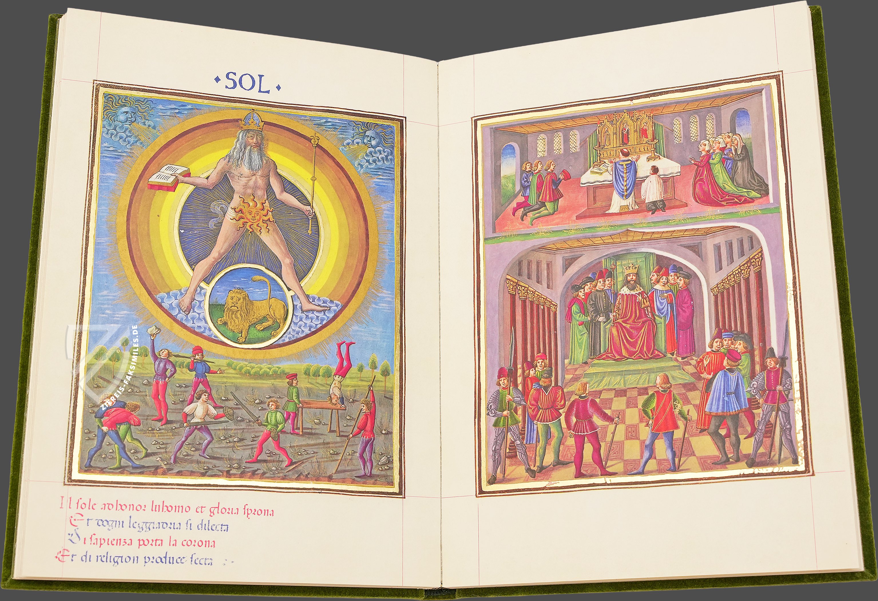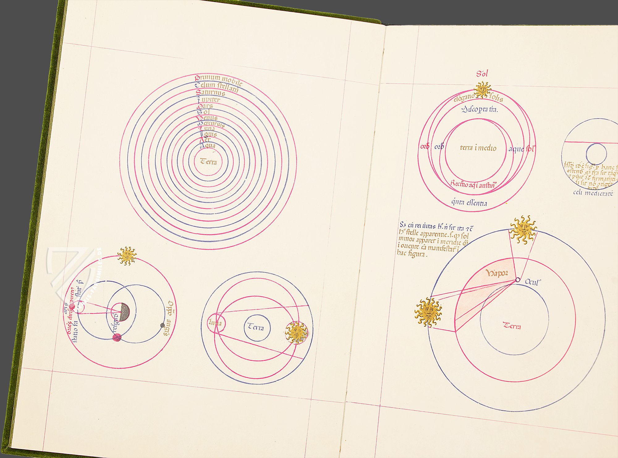 Das astrologische Lehrbuch De Sphaera von Christoforo de Predis (1440–1486) vereint in gekonnter Weise wissenschaftliche Beschreibungen von Sternbildern und Planeten mit bildlichen Schilderungen des alltäglichen Lebens zur Zeit der frühen Renaissance in Italien. Dabei trifft der damals aktuelle Stand der Astronomie auf althergebrachte Mythen und Legenden, was der humanistischen Handschrift unter anderem ihren besonderen Reiz verleiht. Dazu tragen zudem die 15 ganzseitigen und ausgesprochen kunstvollen Miniaturen mit wunderbaren, allegorischen Darstellungen von Himmelskörpern und detailverliebt ausgearbeiteten Genreszenen bei. Letztere zeigen oft der jeweiligen Jahreszeit entsprechende, aber oft auch davon unabhängige Aktivitäten und Ereignisse wie Gerichtsprozesse und Märkte in wunderschönen, sattgrünen, weiten Landschaften, in die sich verschiedenste Architekturen einfügen – ein herrlicher Einblick in die Welt der beginnenden Renaissance. Diese wunderschönen Bilder werden von 9 faszinierenden astronomischen Zeichnungen und Diagrammen ergänzt, die de Predis Ausführungen präzise illustrieren.