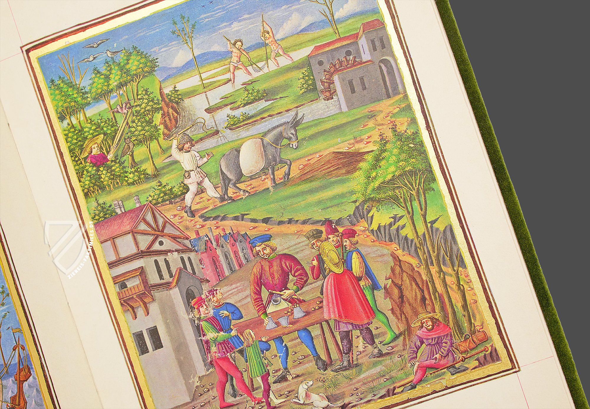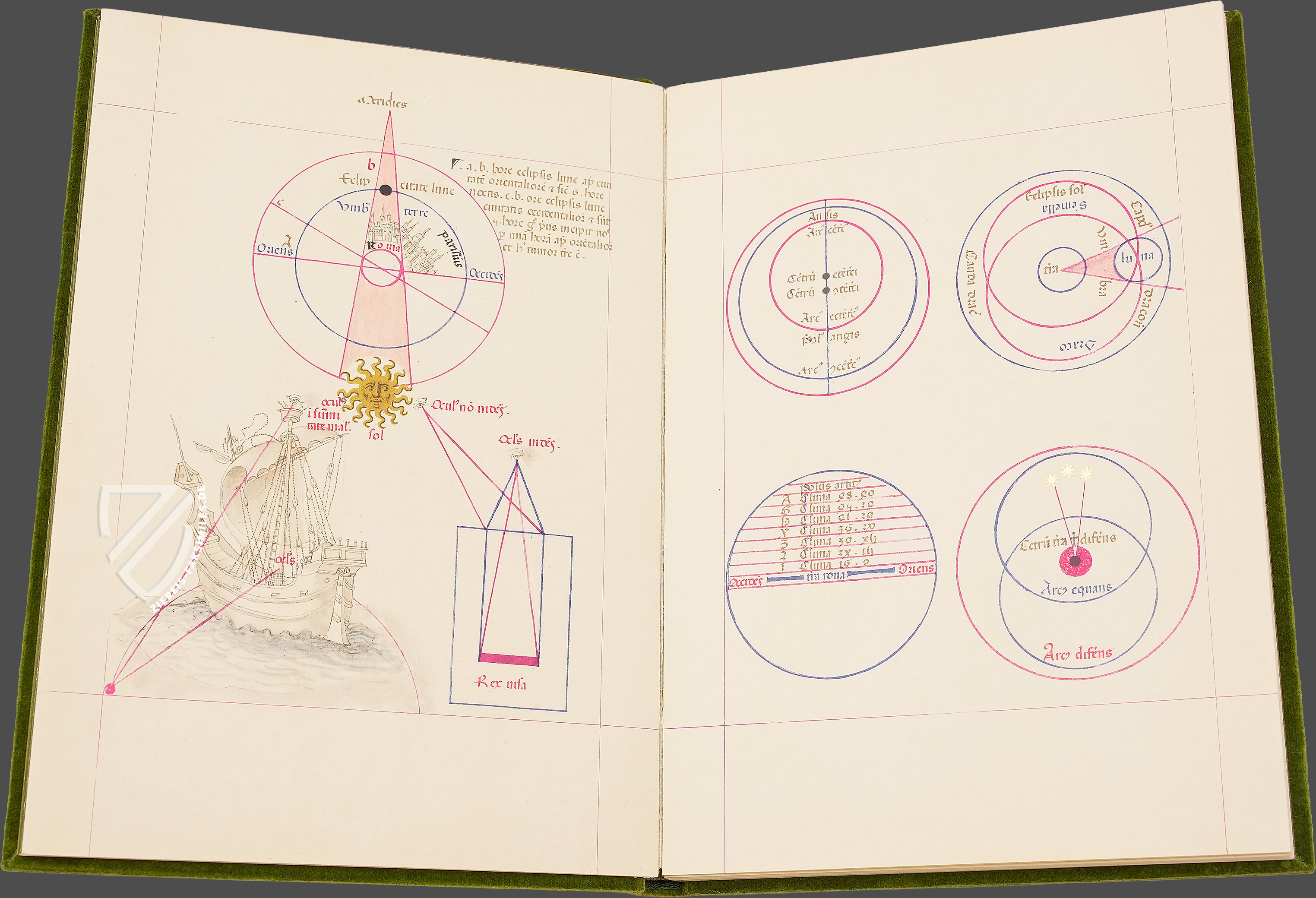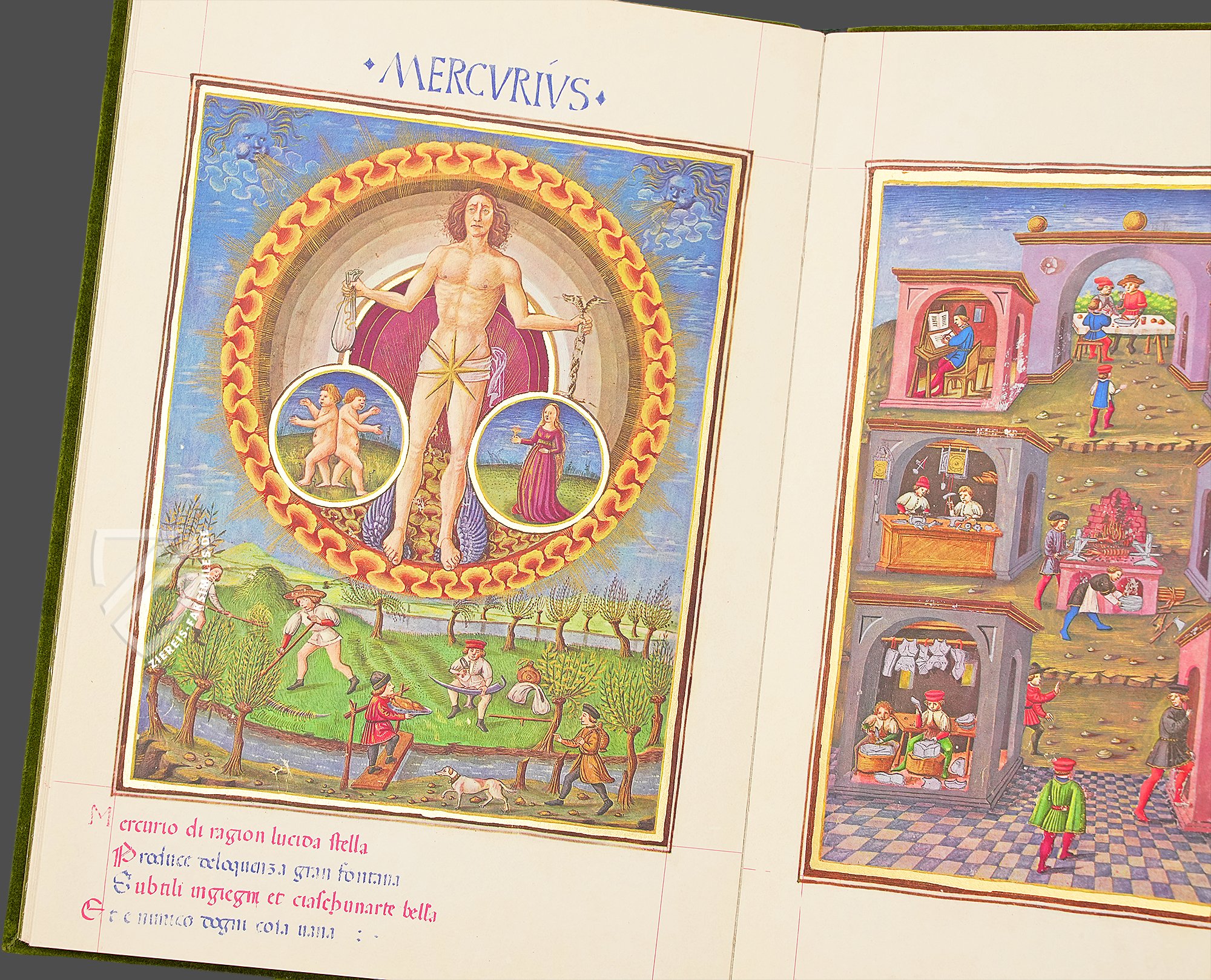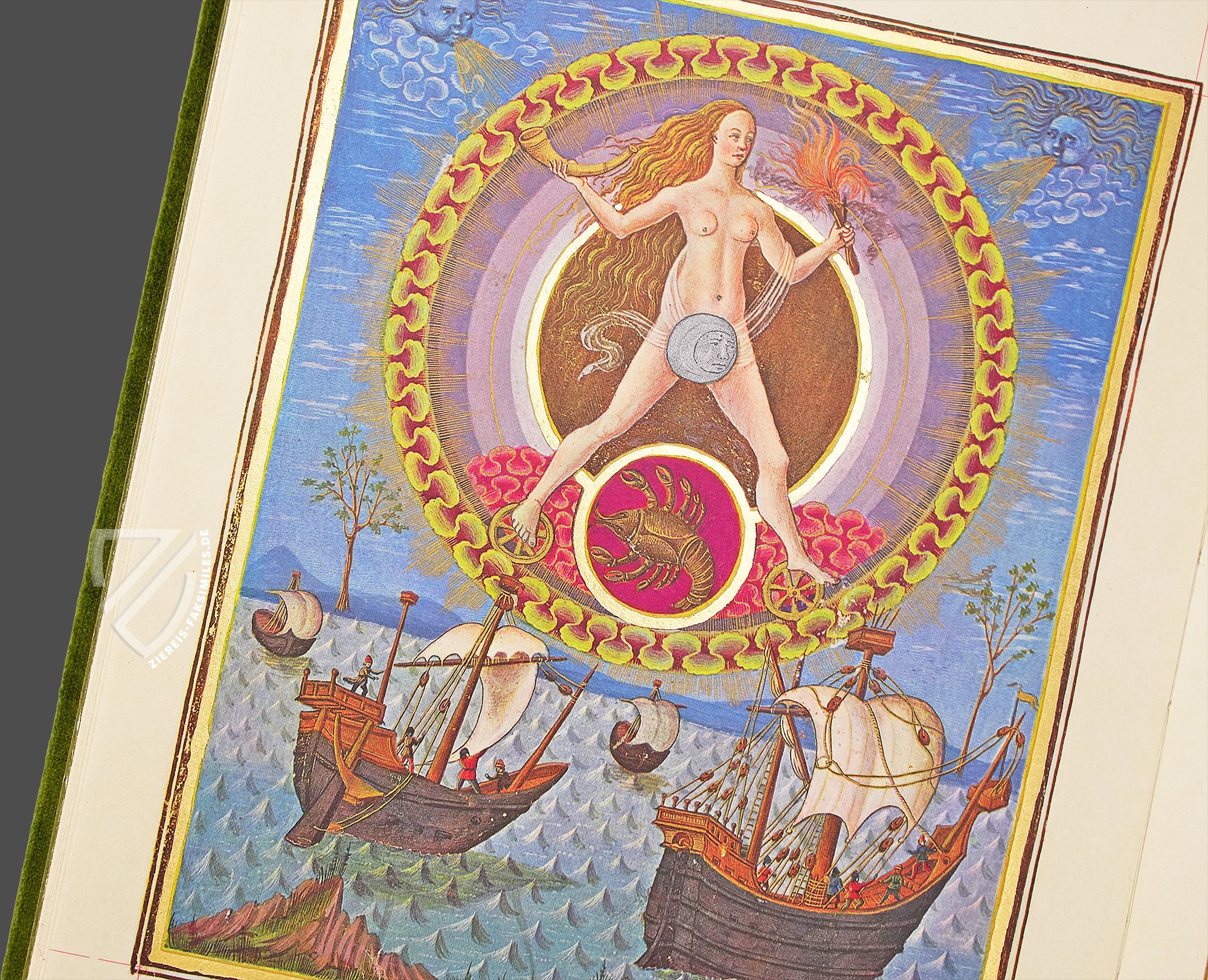Das astrologische Lehrbuch De Sphaera von Christoforo de Predis (1440–1486) vereint in gekonnter Weise wissenschaftliche Beschreibungen von Sternbildern und Planeten mit bildlichen Schilderungen des alltäglichen Lebens zur Zeit der frühen Renaissance in Italien. Dabei trifft der damals aktuelle Stand der Astronomie auf althergebrachte Mythen und Legenden, was der humanistischen Handschrift unter anderem ihren besonderen Reiz verleiht. Dazu tragen zudem die 15 ganzseitigen und ausgesprochen kunstvollen Miniaturen mit wunderbaren, allegorischen Darstellungen von Himmelskörpern und detailverliebt ausgearbeiteten Genreszenen bei. Letztere zeigen oft der jeweiligen Jahreszeit entsprechende, aber oft auch davon unabhängige Aktivitäten und Ereignisse wie Gerichtsprozesse und Märkte in wunderschönen, sattgrünen, weiten Landschaften, in die sich verschiedenste Architekturen einfügen – ein herrlicher Einblick in die Welt der beginnenden Renaissance. Diese wunderschönen Bilder werden von 9 faszinierenden astronomischen Zeichnungen und Diagrammen ergänzt, die de Predis Ausführungen präzise illustrieren.