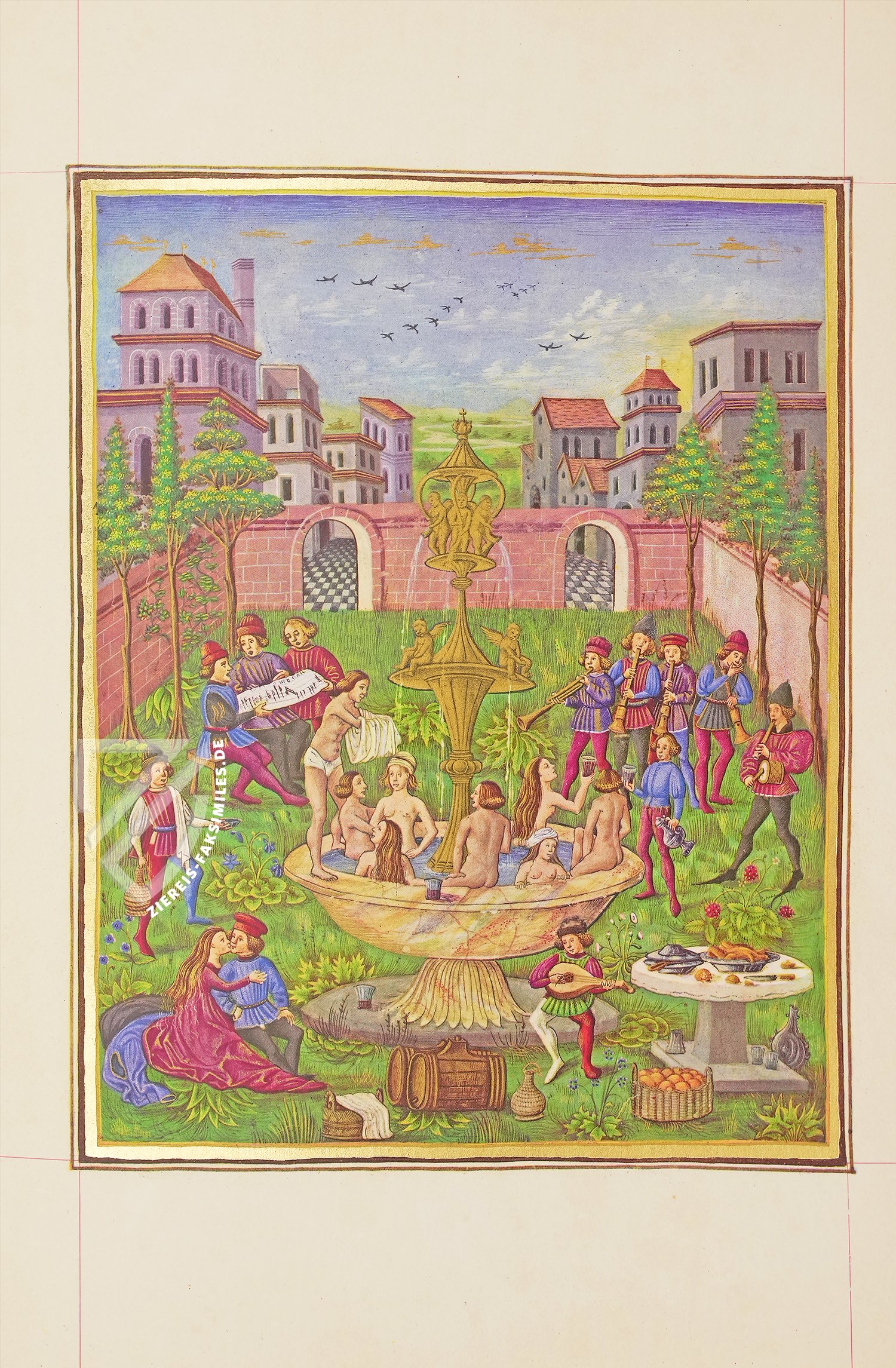 Auch wenn sich diese Handschrift hauptsächlich der Astrologie widmet, stellt sie zugleich eine großartige Quelle für das alltägliche Leben in Europa zu Beginn der Renaissance dar, inklusive mancher brutalerer Aspekte. Religiöse Auseinandersetzungen durchdrangen die spätmittelalterliche Gesellschaft und vor der Reformation wurden zahlreiche ketzerische Bewegungen gewaltsam niedergehalten. Im Hof eines Schlosses kniet hier der Verurteilte Mönchen mit verhüllten Gesichtern gegenüber, die für seine Seele beten, während der Henker mit seinem Schwert im nächsten Augenblick den tödlichen Schlag ausführen wird.