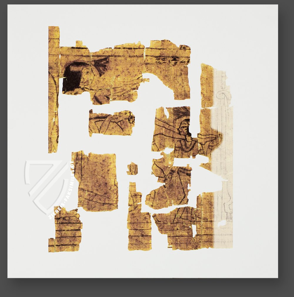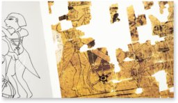Hier haben wir die fragmentarischen Reste der satirischsten Miniatur in diesem einzigartigen Papyrus-Manuskript über die alte ägyptische Erotik sowie seine moderne Rekonstruktion auf der gegenüberliegenden Seite. Es handelt sich um ein Bild von zwei Liebenden: Die Frau kniet auf einem Streitwagen und schaut zurück auf den Mann, der von hinten mit ihr kopuliert. Die geringere Größe der drei anderen Figuren zeigt, dass es sich um Diener handelt.