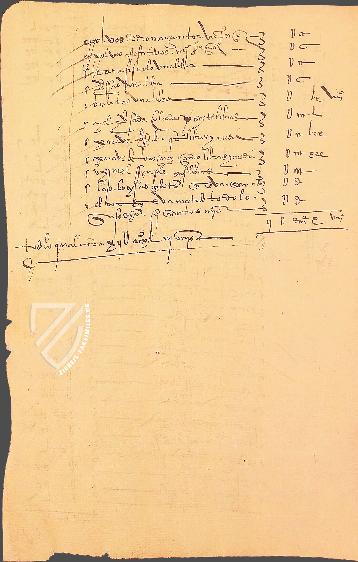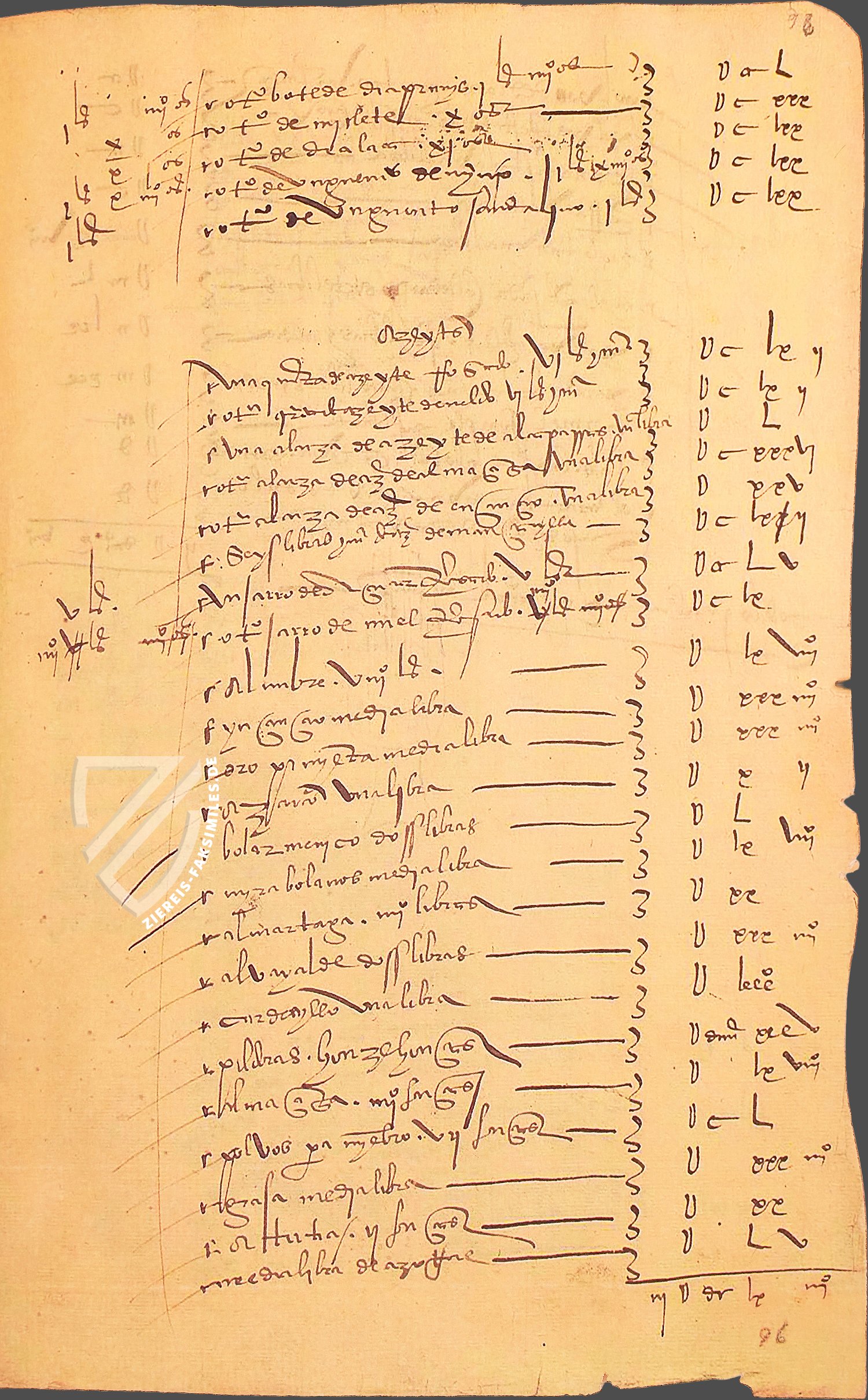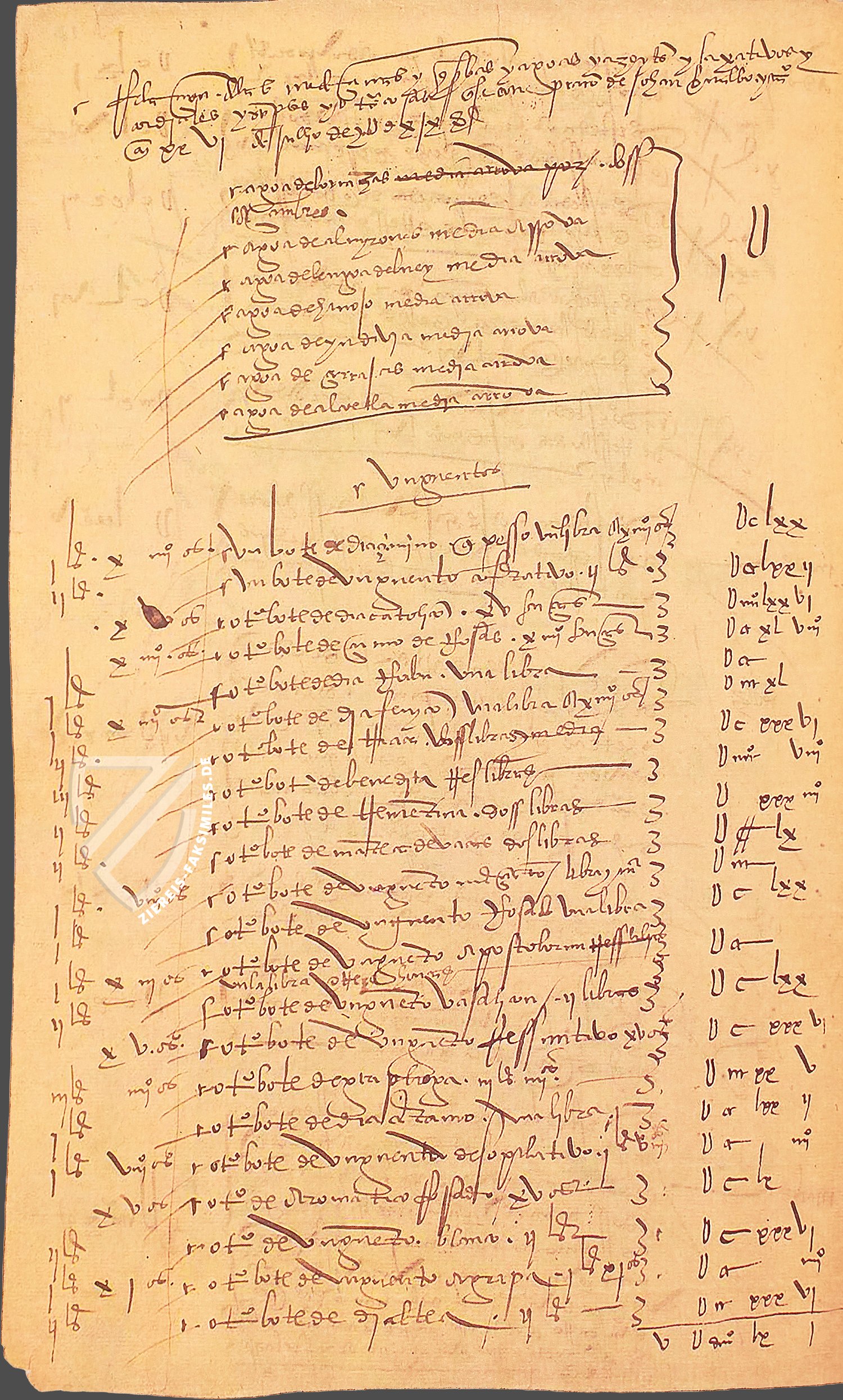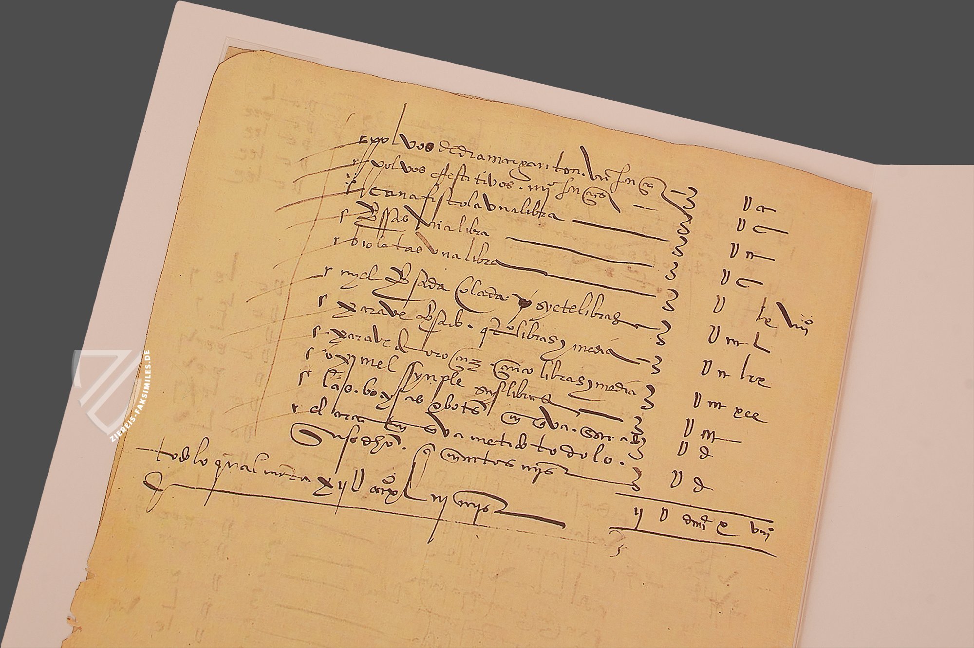 Juan Bernal besorgte für die historische Expedition eine ganze Reihe an Heilmittel, Salben, Tinkturen, Wässerchen, Ölen und sonstigem, was die Gesundheit der Besatzung aufrechterhalten sollte. Dabei notierte er penibel die genaue Mengenangabe eines jeden Mittelchens ebenso wie die Preise, die er dafür bezahlte. Letztere sind in der schmalen Spalte rechts aufgeführt.