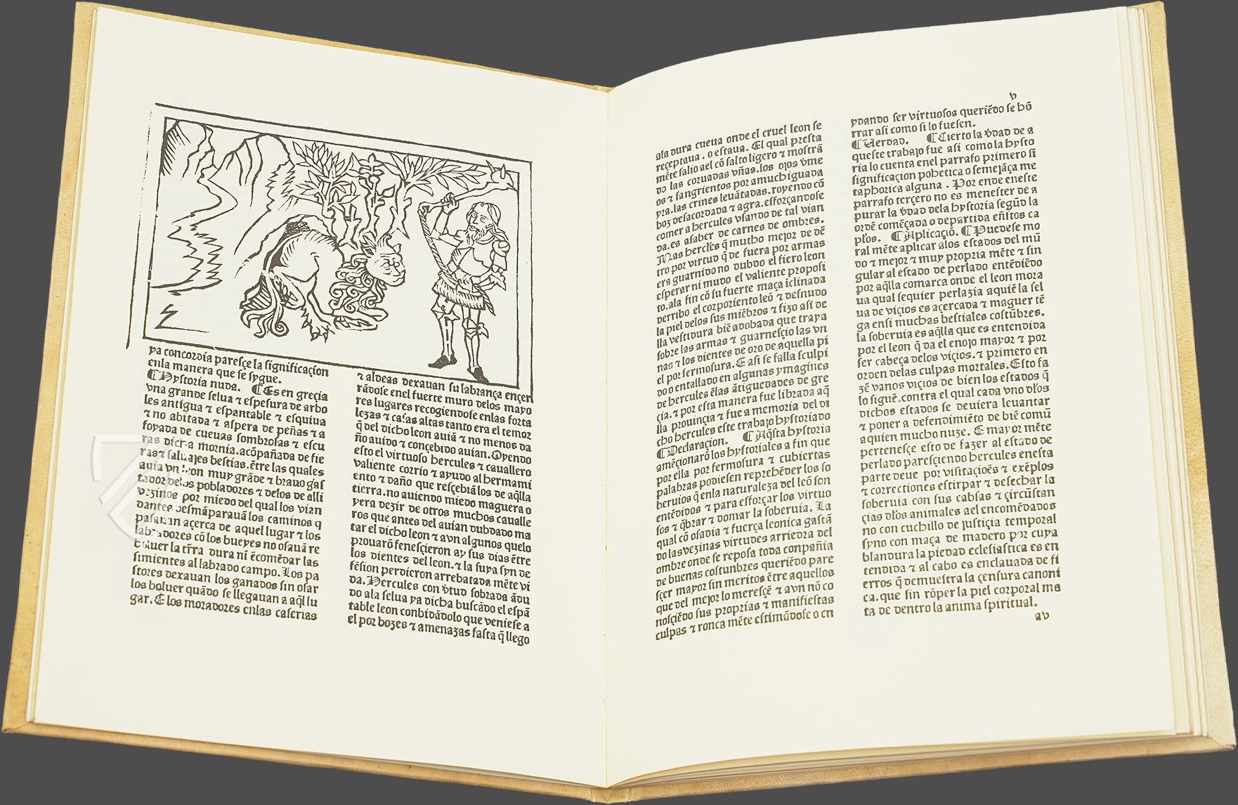 Geboren als Sohn von Zeus und einer sterblichen Frau namens Alkmene, war Herkules ein römischer Held, der für seine große Stärke berühmt war und eine der beliebtesten und bekanntesten Figuren der griechischen Mythologie war und ist – sowohl im Mittelalter als auch heute noch. Wie es für antike heidnische Mythen und auch andere Texte üblich war, wurde seine Geschichte von mittelalterlichen Autoren zu einer christlichen Allegorie umgedeutet. Einer dieser Autoren war Marqués Enrique de Villena (1384–1434), ein spanischer Adeliger, Schriftsteller, Dichter und Theologe. Er verfasste 1417 eine katalanische Version des antiken Helden-Mythos, die seine Leser zu einem ehren- und tugendhaften Leben motivieren sollte und die er später ins Kastilische übersetzte. Auf Grundlage dieser Übersetzung erschien am 15. Januar 1483 die erste Ausgabe, die Antón de Centenera (um 1450–1504) in Zamora druckte. Die spanische Inkunabel war ursprünglich mit zwölf großen Holzschnitten ausgestattet, von denen elf erhalten sind und die je eine der zwölf Arbeiten des Herkules illustrieren. Ein wunderbares Zeugnis der frühen spanischen Druckkunst!