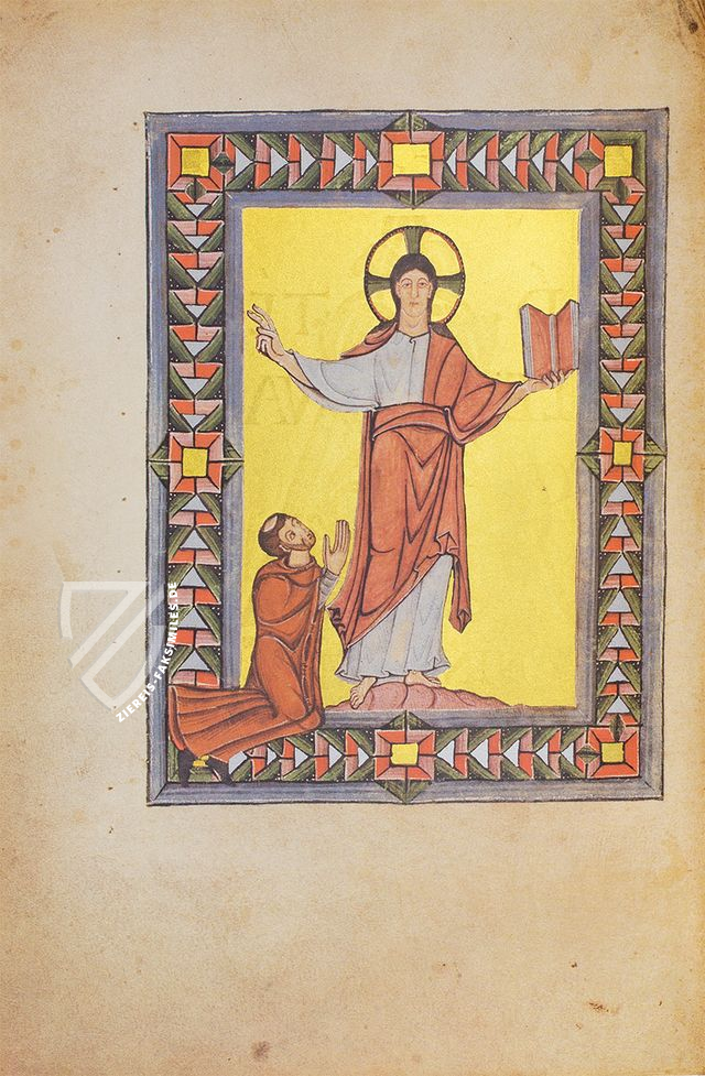 Hier haben wir eine prächtige ottonische Miniatur vor einem polierten Goldgrund im byzantinischen Stil, der dem Bild ein zeit- und raumloses Flair verleiht. Christus hat eine monumentale, statische Erscheinung und blickt ruhig auf, ja sogar durch den Betrachter hindurch. Mit ausgestreckten Armen macht er mit der rechten Hand das Segenszeichen und hält mit der linken das Evangelium.