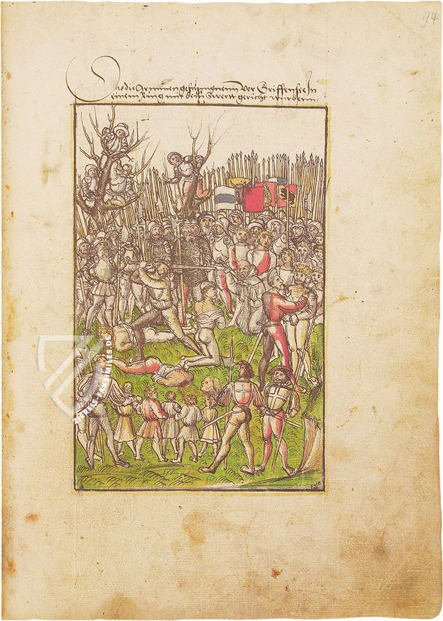 Der Scharfrichter holt zum Schlag aus, wĂ€hrend das letzte Opfer kniet und seine bereits enthaupteten Kameraden auf dem Boden liegen. Auf der rechten Seite warten weitere Soldaten der verschiedenen eidgenössischen Kantone, deren Banner und Speere den Hintergrund wie einen Wald fĂŒllen. Um ihre Ohnmacht zu unterstreichen, sind die Bauern von Greifensee klein im Vordergrund abgebildet.