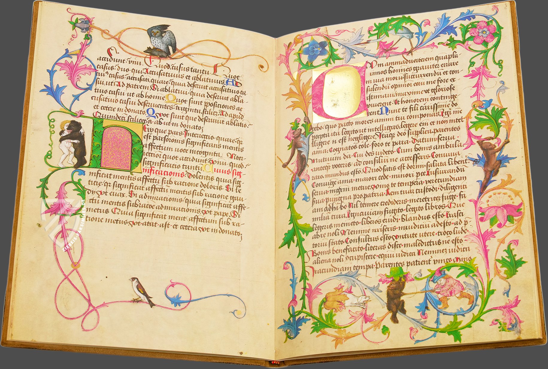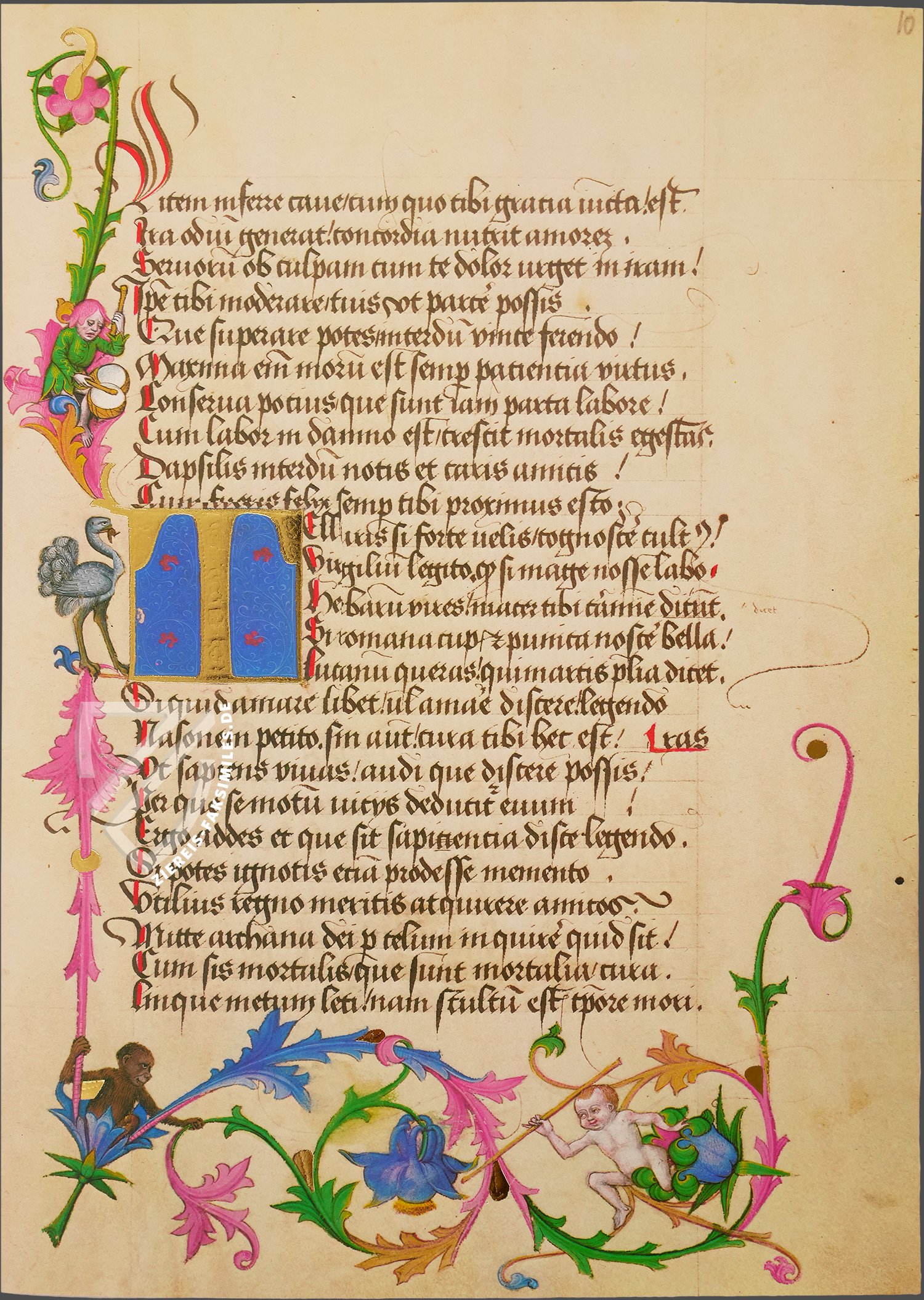 Die groĂe rosafarbene âMâ-Initiale mit feinen AkanthusblĂ€ttern in einem Rahmen aus geprĂ€gtem Blattgold ist mit einer Darstellung des Prinzen und seinem Lehrer geschmĂŒckt. Der Prinz, welcher mit wallenden blonden Locken abgebildet ist, ist in ein prĂ€chtiges blau-goldenes Brokatgewand gehĂŒllt, sein Lehrer neben ihm trĂ€gt ein rot-weiĂes Gewand. Neben der historisierten Initiale wird die Textseite von leuchtenden Buchstaben in Blau und Gold geziert.