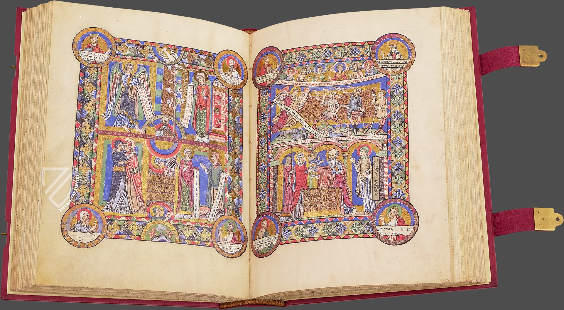 Das wunderschöne, spannende Evangeliar beeindruckt seine Betrachter seit vielen Jahrhunderten mit seinem erstaunlichen Buchschmuck. Die vielen kostbaren Bilder zeigen eine große Auswahl intensiver Farben und wurden geradezu opulent mit Gold besetzt. Die von Hand gestalteten Szenen, die jeden Leser in ihren Bann ziehen, gehören zur hochwertigsten Buchmalerei des gesamten Mittelalters. Neben Darstellungen der christlichen Heilsgeschichte finden sich auch Szenen, die dem Auftraggeber der wertvollen Schrift gewidmet sind. Ein besonders aufregend gestaltetes, ganzseitiges Bild stellt die Krönungsszene Heinrichs und seiner Frau Mathilde, einer Tochter von König Heinrich II. von England dar. In einer anderen Bildszene wird das Herrscherpaar zu einer thronenden Maria geführt und Heinrich bietet Maria das Evangeliar dar. Die bewegenden Bilder versetzen ihr Publikum ins Träumen und laden ein zu einer Reise in die Glaubenswelt der großen Herrscher der Gotik.