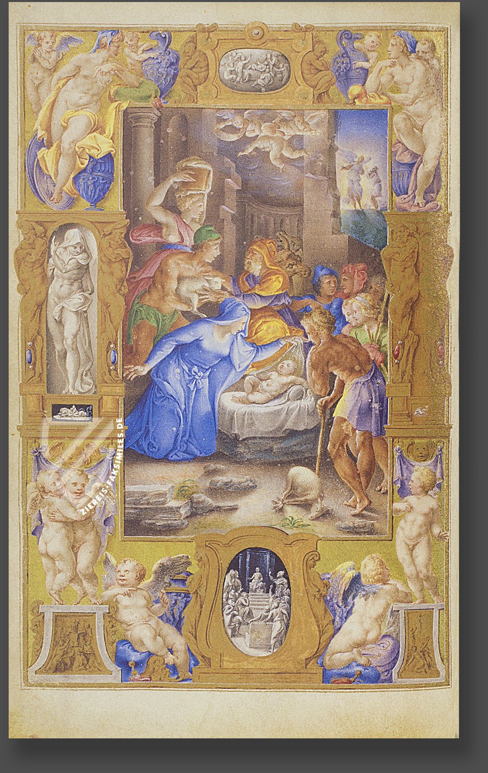 Im Italien der Renaissance ging es um Prachtentfaltung, vor allem unter den verschiedenen Fürsten Italiens, seien es weltliche oder kirchliche Fürsten. Kardinal Alessandro Farnese (1520-1589), ein Spross einer der mächtigsten Dynastien Italiens, war auch einer der größten Kunstmäzene des 16. Jahrhunderts. Alessandro stammte in direkter Linie von Papst Paul III. ab und gab wunderbare Kunstwerke in Auftrag, die seine stolze Abstammung widerspiegeln sollten. Sein exquisiter Geschmack zeigt sich auch in seinem Gebetbuch, für dessen Ausschmückung er den in Kroatien geborenen Giulio Clovio (1498-1578), den talentiertesten Miniaturisten der späten Renaissance, engagierte. Seine Zeitgenossen priesen Clovio als Ausnahmetalent, gerade weil es ihm gelang, seine Miniaturen so sehr großformatigen Tafel- oder Staffeleibildern ähneln zu lassen. Im Farnese-Stundenbuch findet das Wesentliche also in den Bordüren und den 26 Miniaturen statt, wo das Auge unschätzbar viel zu entdecken hat.
