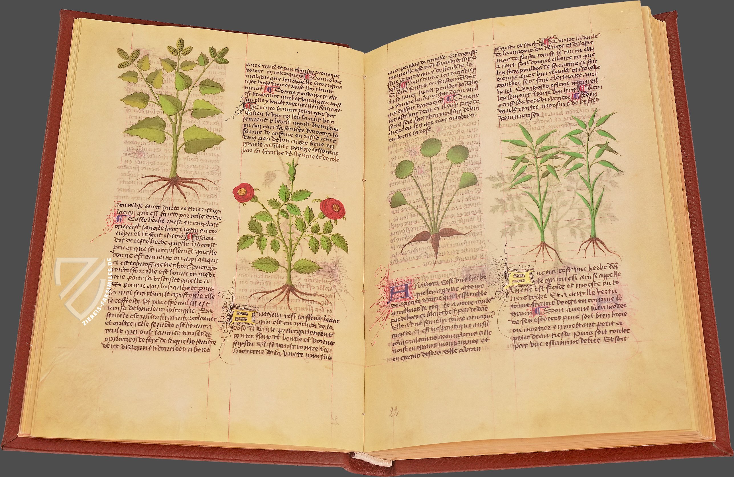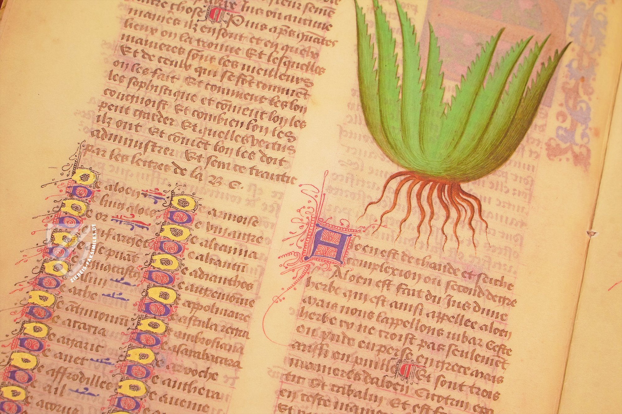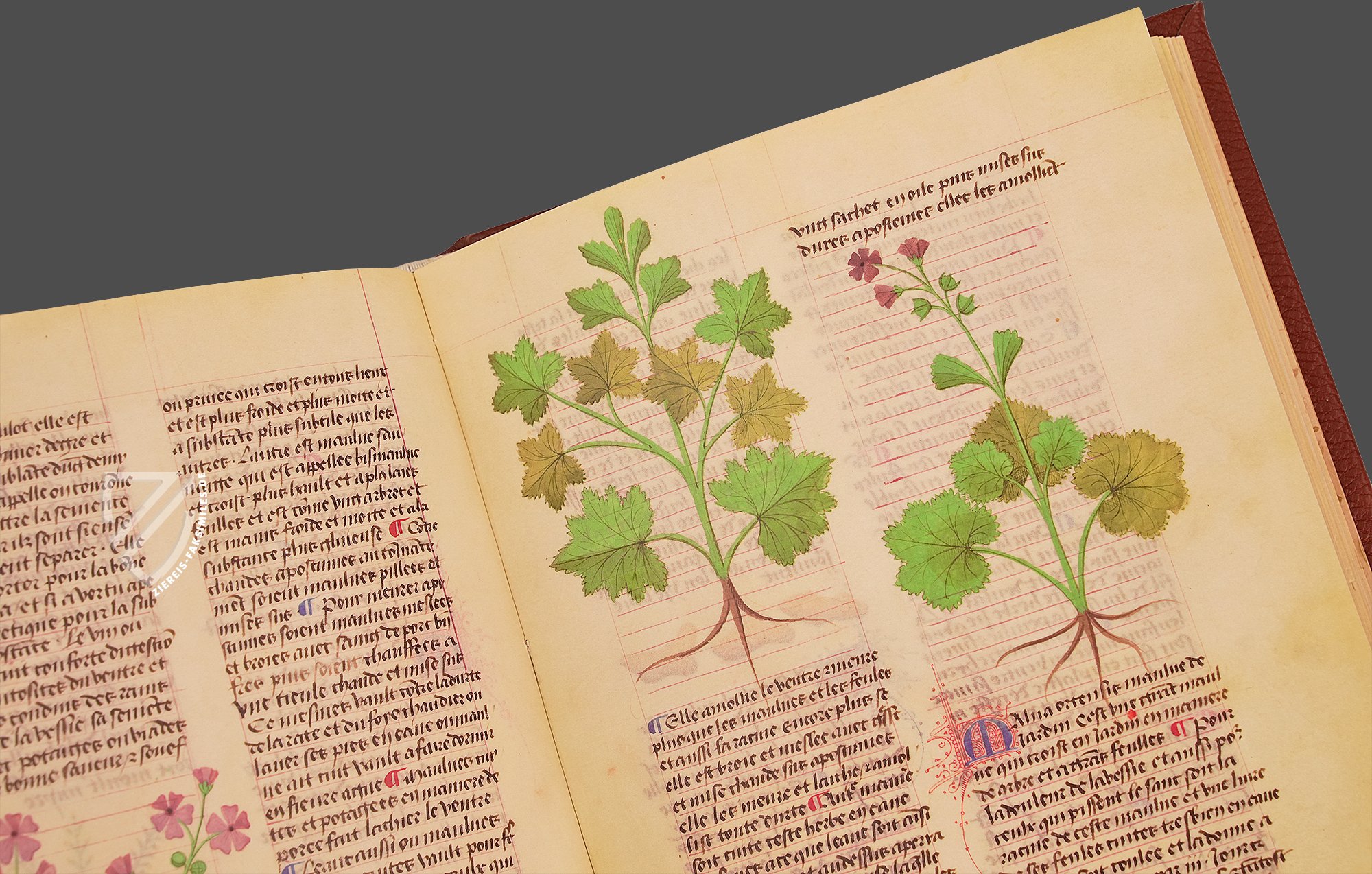 Eine der berĂŒhmtesten Schriften zur Medizin und Pflanzenkunde des Mittelalters: De simplicibus medicinis des MatthĂ€us Platearius. Dieses Werk des berĂŒhmten Mediziners der Schule von Salerno fĂŒhrt 500 Pflanzen, KrĂ€uter und andere Heilmittel auf, die teilweise auch tierischen Ursprungs sind. Sie sind bemerkenswerterweise alphabetisch angeordnet, was im Mittelalter keinesfalls die Regel war. Dabei bietet der umfangreiche Text faszinierende und oft mystisch wirkende Angaben zu ihrer Gewinnung, Anwendung und Wirkung im menschlichen Körper. Diese kostbare Handschrift, die in der zweiten HĂ€lfte des 15. Jahrhunderts in Frankreich geschaffen wurde, enthĂ€lt den einflussreichen Text in französischer Ăbersetzung und ist herrlich illuminiert mit wunderschönen Darstellungen der vorgestellten Heilmittel. Hinzu kommen kostbare, vergoldete Zierinitialen, die den Wohlstand des unbekannten Auftraggebers und den ReprĂ€sentationszweck der Handschrift deutlich machen. Dieser Codex wurde nicht jeden Tag von einem Arzt benutzt, sondern stellte die Gelehrtheit seines Besitzers zur Schau.