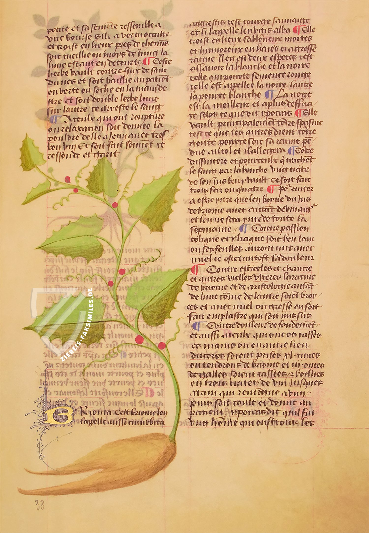 Diese besonders eindrucksvolle Ausgabe des berĂŒhmten Textes war sicherlich der Auftrag einer hochrangigen Persönlichkeit. Jede der 340 Seiten ist nĂ€mlich prachtvoll bebildert, teilweise sogar mit mehreren Darstellungen. Die Pflanzen und Heilmittel wurden mit detaillierten Abbildungen von Wurzeln, BlĂ€ttern, FrĂŒchten und BlĂŒten realistisch illustriert. ZusĂ€tzlich finden sich Tiere, Mineralien und figĂŒrliche Szenen bĂ€uerlicher Arbeit, die den Abbau von Schwefel oder das Sammeln von Aloe-Zweigen zeigen. Kostbare kleine FleuronnĂ©-Initialen, manchmal sogar mit Blattgold akzentuiert, runden das eindrucksvolle Werk ab!