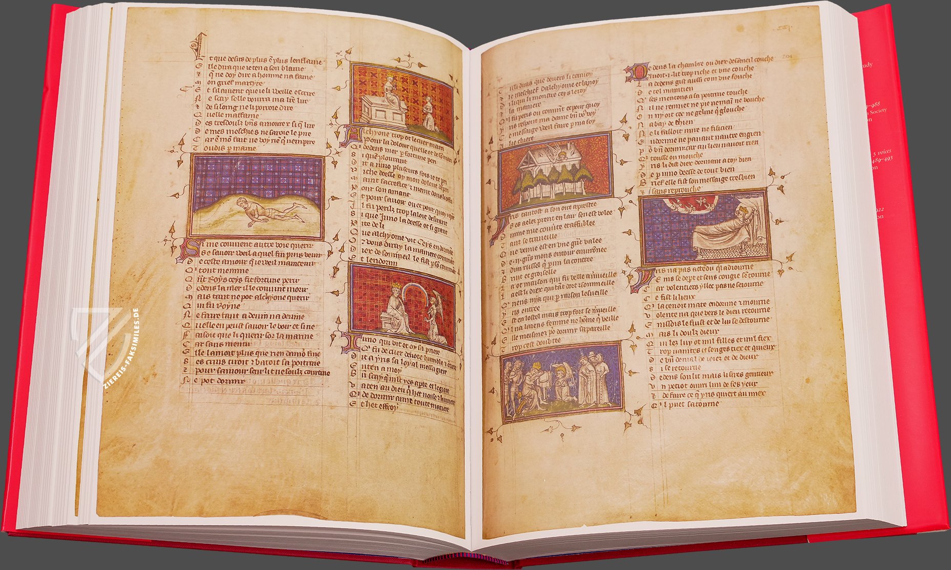 Von mehreren heute überlieferten Manuskripten ist die Ferrell-Vogüé Machaut Handschrift die größte und umfassendste. Es ist anzunehmen, dass Machaut die Herstellung solcher Bücher zu Präsentationszwecken vor den Mitgliedern des französischen Königshauses förderte. Dieser Zweck erklärt auch die 118 reizenden Miniaturen, die in der Werkstatt des Boqueteaux-Meisters entstanden. Der in Deutschland aufgrund seiner Darstellung von schirmähnlichen Bäumen, die sich in spärlichen Gruppen zu Wäldern formieren, auch Meister der Wäldchen genannte Buchmaler, arbeitete mit acht weiteren Künstlern und fünf Schreibern zusammen. In variationsreichen Abständen gliedern sich die einladenden Darstellungen in den zweispaltigen Text, wobei sie ein schlichter Rahmen mit feinen Ranken umschließt.