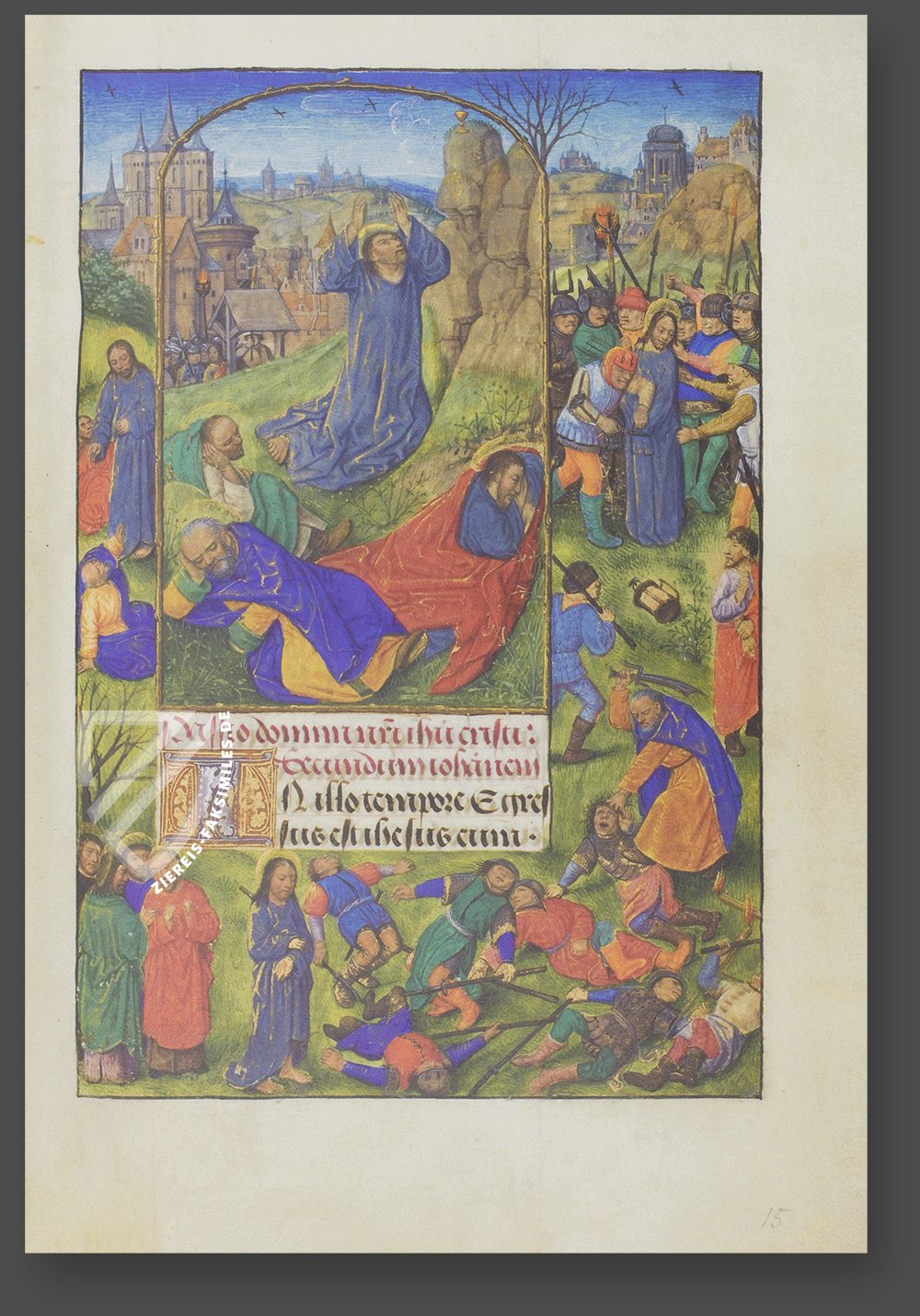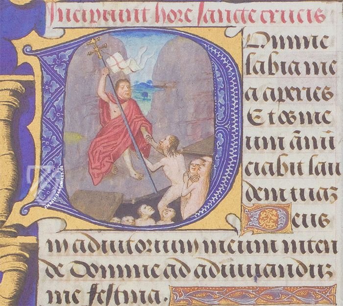 Während der drei Tage nach seiner Kreuzigung und vor seiner Auferstehung stieg Jesus triumphierend in die Hölle hinab, verkündete den Toten die Frohe Botschaft und brachte allen Gerechten, die seit Anbeginn der Welt gestorben waren, die Erlösung. Das Kreuz mit der Siegesfahne schon in der Hand, wird Christus in einer historisierten D -Initiale gezeigt, wie er in seinem roten Umhang zu den Bewohnern der Hölle gelangt. Die Initiale selbst enthält Blattgold als Rahmen und ein blaues Muster aus Akanthusblatt.