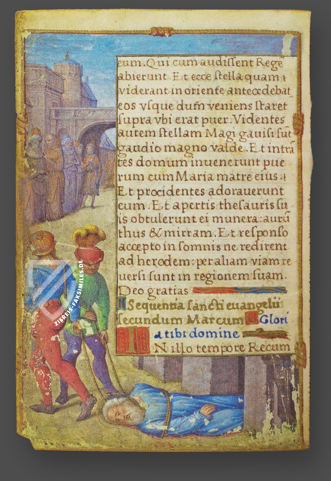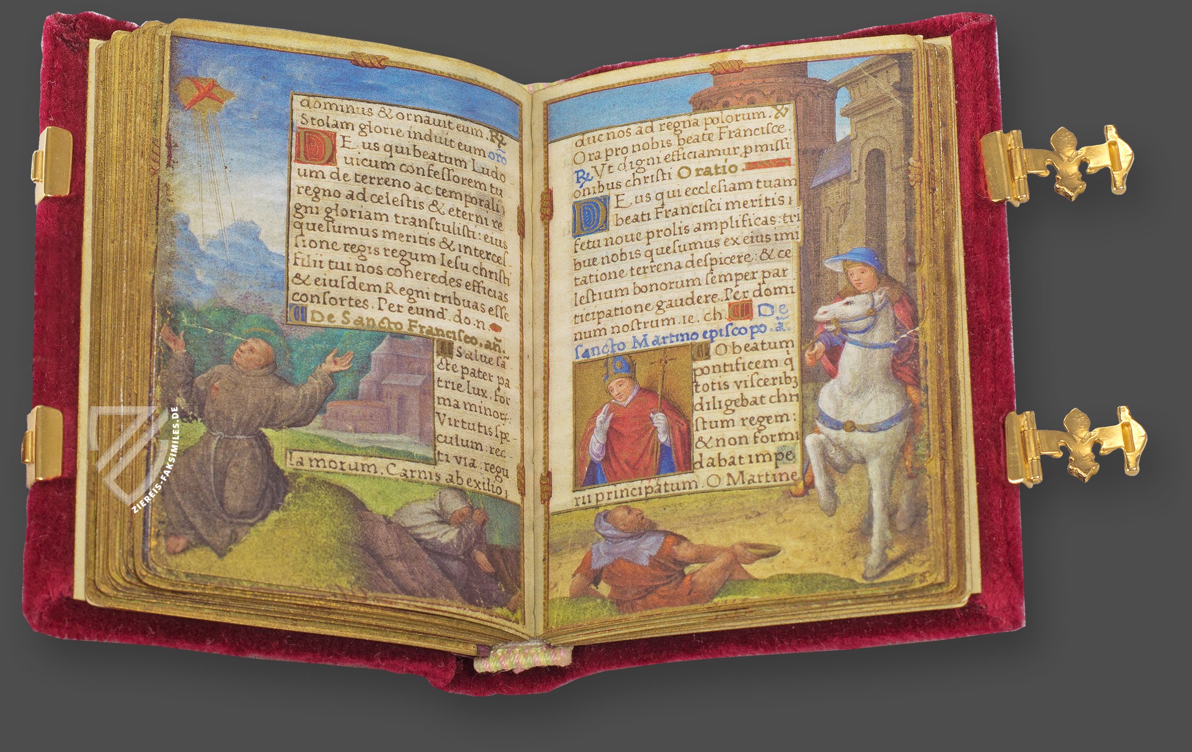 Trotz der recht handlichen GröĂe des Manuskripts schuf der so genannte Meister der Claude de France ein prĂ€chtiges Werk der Buchmalerei fĂŒr den persönlichen Gebrauch von Königin Claude (1499â1524). Diese Szene spielt in einem Innenraum mit einer Renaissance-TĂŒr und zeigt den heiligen Hieronymus, wie er kurz vor seinem Tod am 30. September 420 in der NĂ€he von Bethlehem die Sterbesakramente erhĂ€lt.