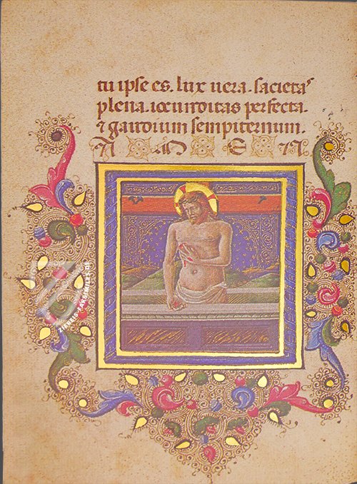 Nach dem an die Kommunion anschließenden Dankgebet, findet sich die einzige Miniatur dieses kleinen königlichen Gebetbüchleins. Umgeben vom typischen floralen Ornament der italienischen Frührenaissance und in einem prächtigen gold-blauen Rahmen erscheint Christus hier als Schmerzensmann – eine Ikonografie, die das Leiden Christi in den Vordergrund stellt und die Betrachterin zum Nachempfinden anregen sollte.