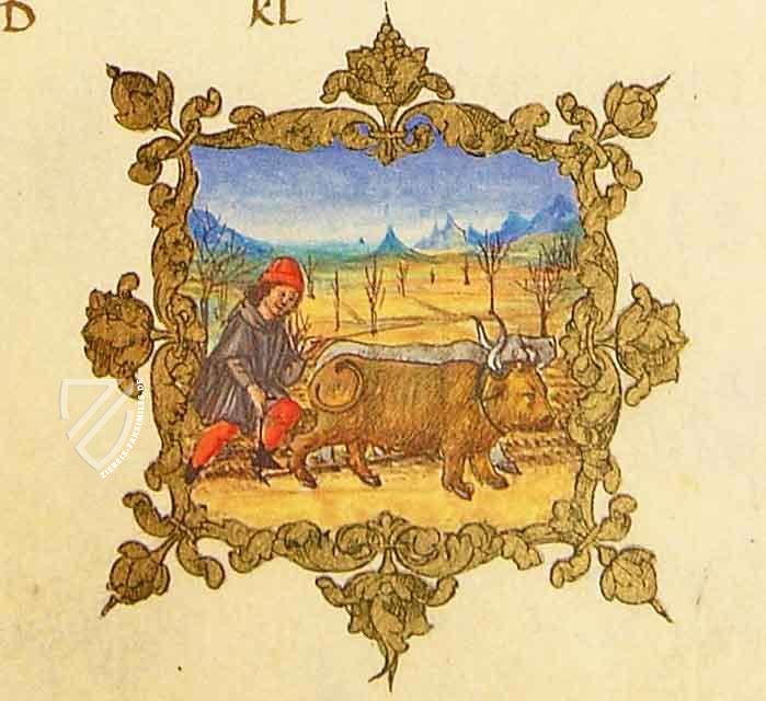 Die Medaillonminiatur für dieses Kalenderblatt zeigt eine typische Arbeit des Monats, aber wie bei vielen landwirtschaftlichen Tätigkeiten hängt diese Szene davon ab, wo das Manuskript entstanden ist. Die meisten illuminierten Kalenderblätter zeigen bereits im Oktober eine Szene, in der gepflügt oder Winterroggen gesät wird. Aber da dieses Manuskript aus dem sonnigen Italien stammt, kommt diese Tätigkeit einen Monat später an die Reihe. Hier wird ein Bauer gezeigt, wie er seine zwei Ochsen vor einem Hintergrund aus kargen Bäumen und fernen Alpengipfeln innerhalb eines prächtigen Blattgoldrahmens antreibt.