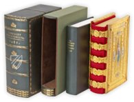 Dieser aufwändige Bucheinband besteht aus fünf farbenfrohen Emaille-Einlagen in vergoldetem Silber über Holzdeckeln, auf das Rosen, Akanthusblätter, Bänder und geflochtene Kordeln eingraviert sind. Das darunter liegende Silber ist an einigen Stellen durch das Gold hindurch sichtbar, was darauf hinweist, dass es sich in der Tat um ein persönliches Andachtsmanuskript handelte, das häufig verwendet wurde. Er wurde von einem unbekannten Goldschmied etwa 1485 gefertigt.