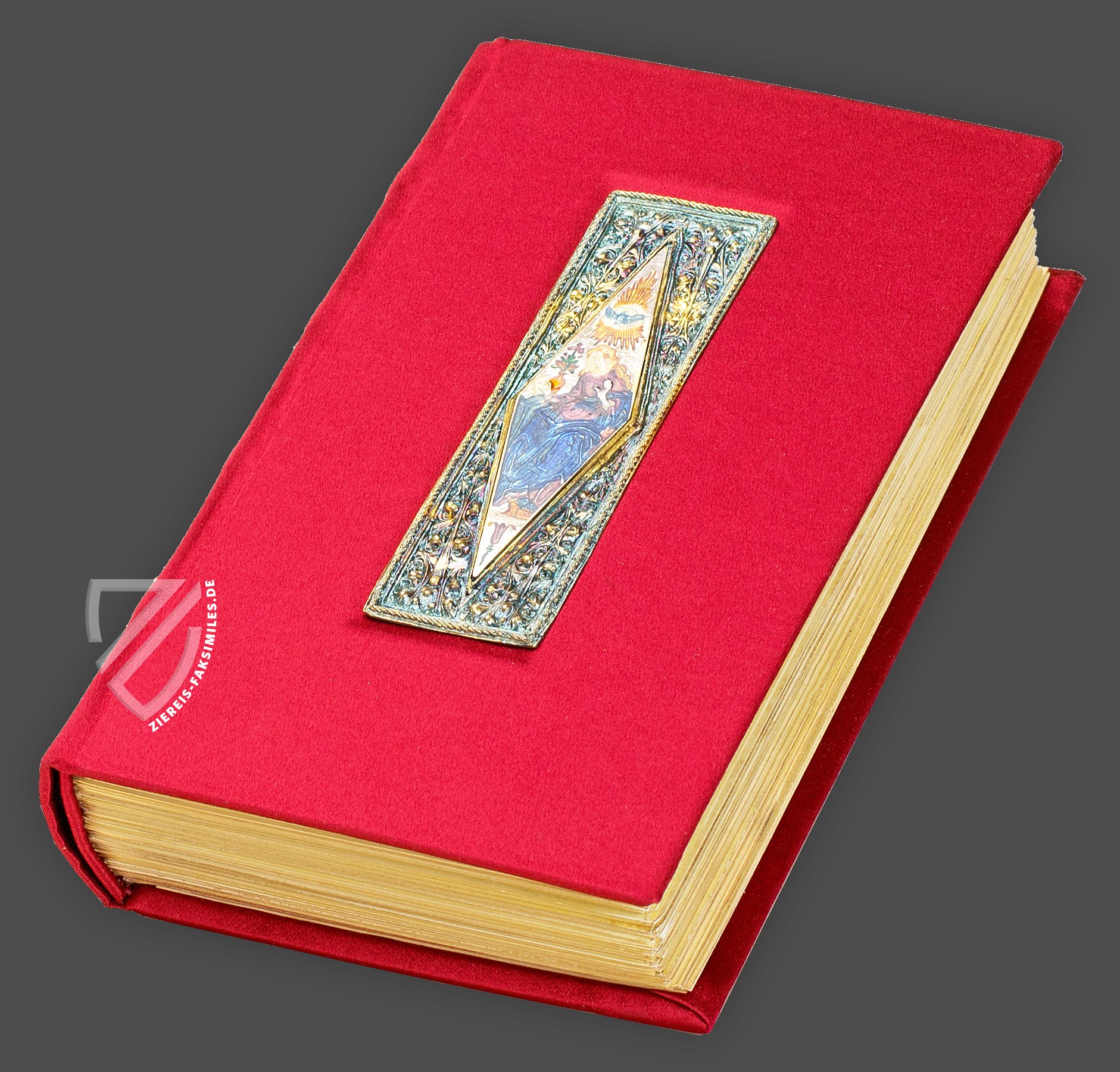 Die zentrale Emaille zeigt den Erzengel Gabriel (auf dem rückseitigen Einband die Jungfrau Maria), umgeben von vier weiteren Emailles mit Blumen in Amphoren, Ranken und einem Vogel. Fünf ebenfalls aus vergoldetem Silber gefertigte Scharniere verbinden die nahezu identische Vorder- und Rückseite des Einbands und bestehen aus symmetrisch angeordneten Palmetten, die jeweils eine Blüten in der Mitte rahmen.