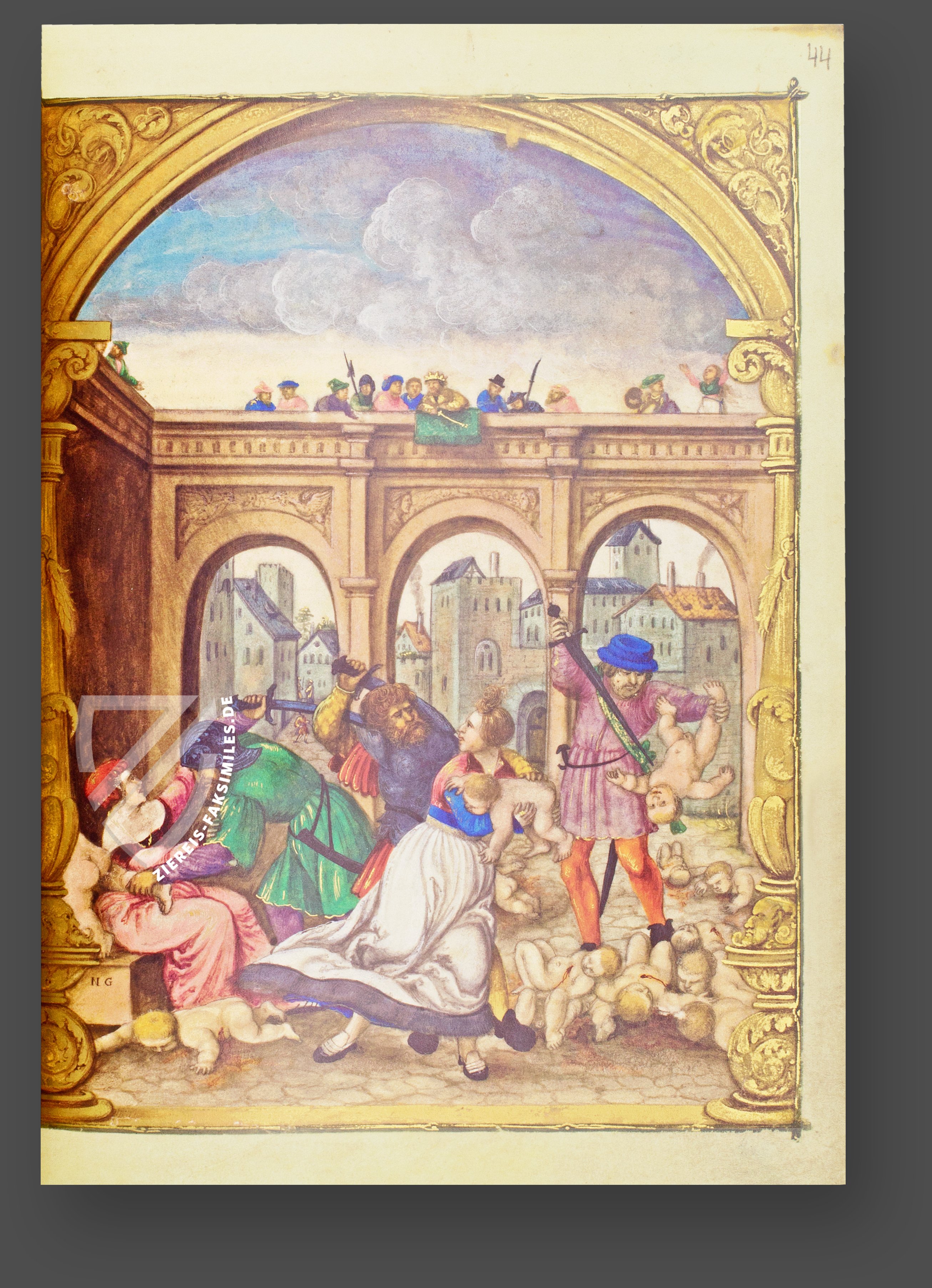 Diese gewalttĂ€tige Episode gewann bei KĂŒnstlern der Renaissance wieder an PopularitĂ€t: Sie konnten damit die GrĂ€ueltaten zeitgenössischer Religionskriege mit der BrutalitĂ€t der Antike vergleichen. Diese Miniatur zeigt die Kleidung und die Architektur des 15. Jahrhunderts und ist besonders durch die Mimik der lebenden und toten Figuren beeindruckend. König Herodes steht mit seinen Gefolgsleuten auf dem Mittelbogen und schaut gelangweilt auf das Gemetzel hinunter.